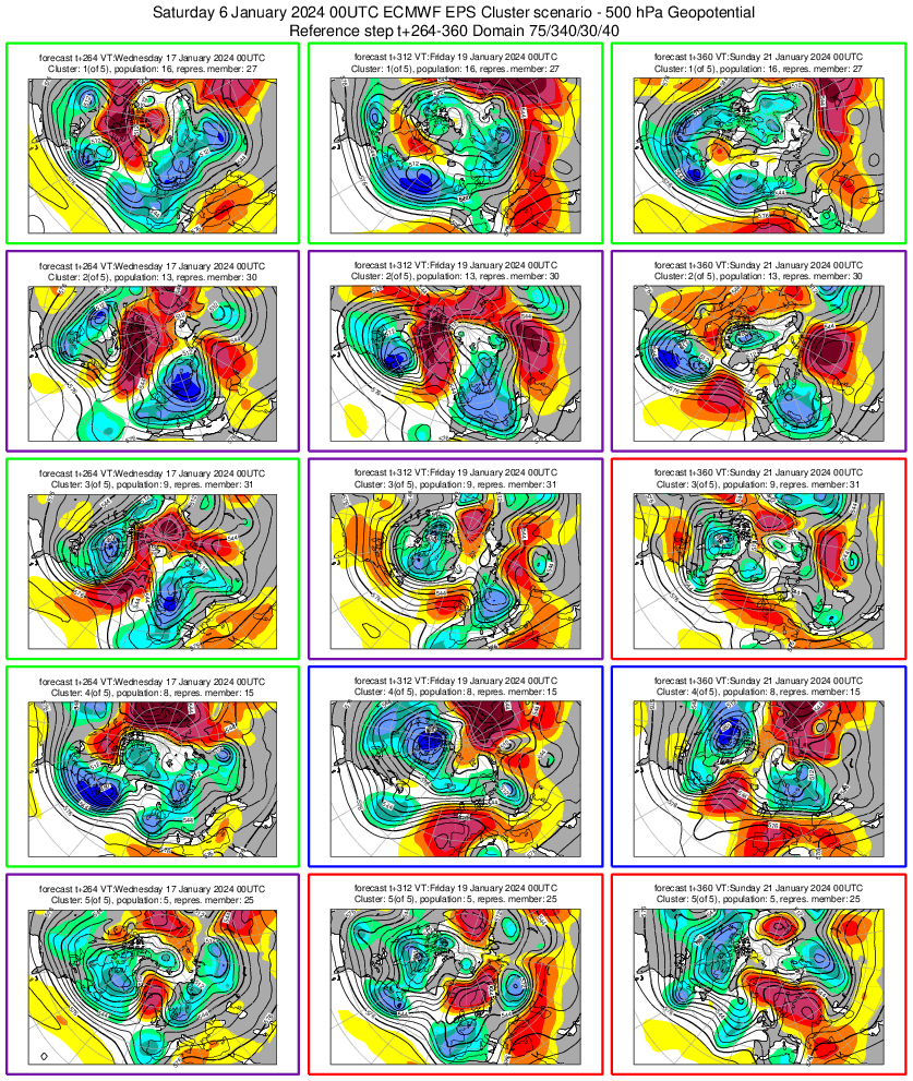 Van de clusters die ECMWF toont op de zeer lange termijn, vallen er nog een aantal kennelijk net binnen de grenswaarden van een regime dat we zouden omschrijven als relatief koud (-NAO, ATR, BLOCK) in het winterseizoen.