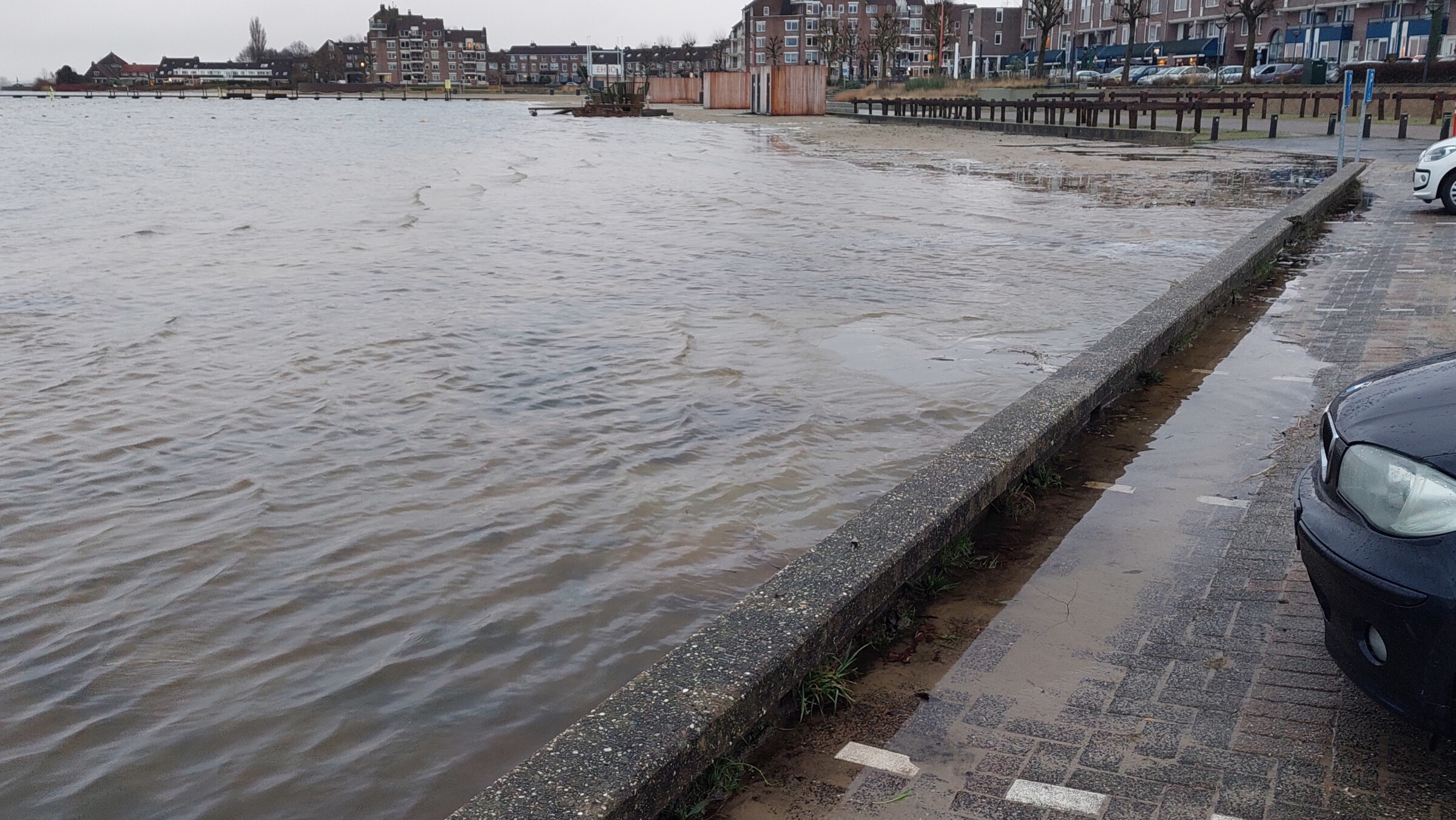 Normaal is het strandje hier ongeveer 10 meter breed, nu zo goed als onder water.
