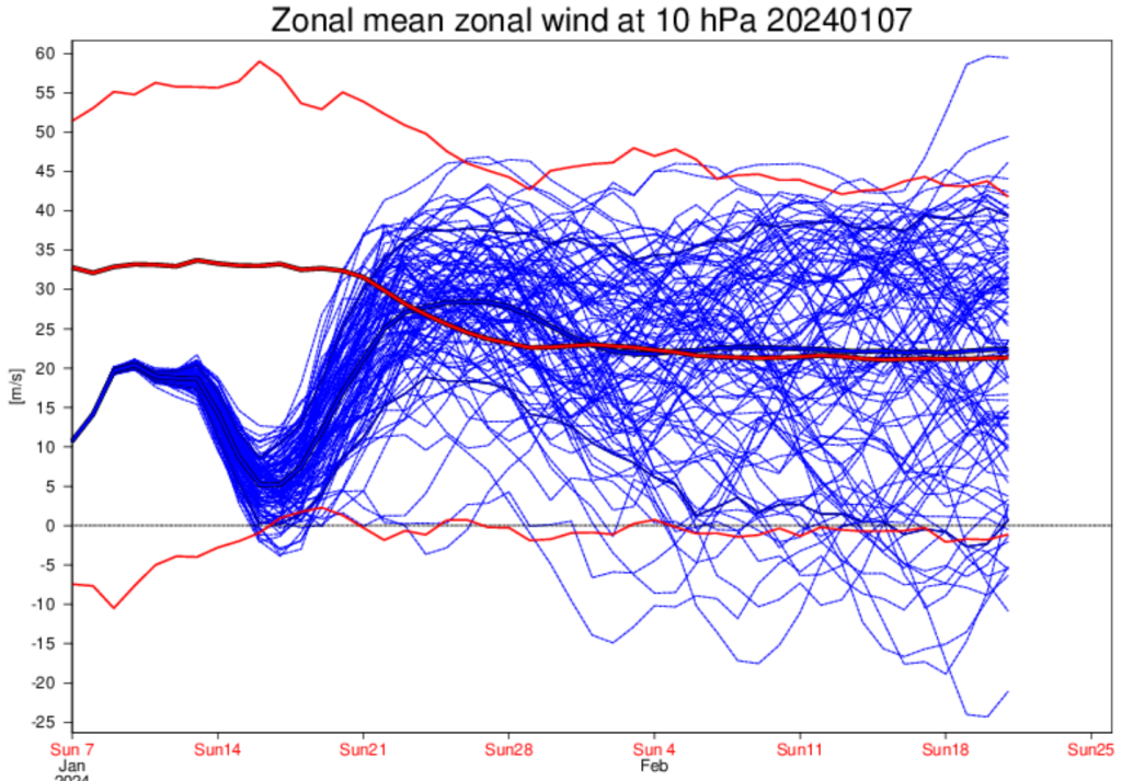 Geen SSW deze winter wanneer we naar de zonale winden kijken.