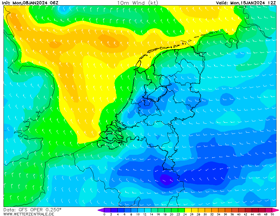 Wind is eerst west en op getoonde kaart west-noordwest.