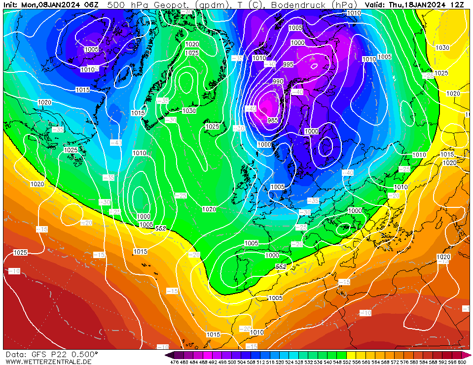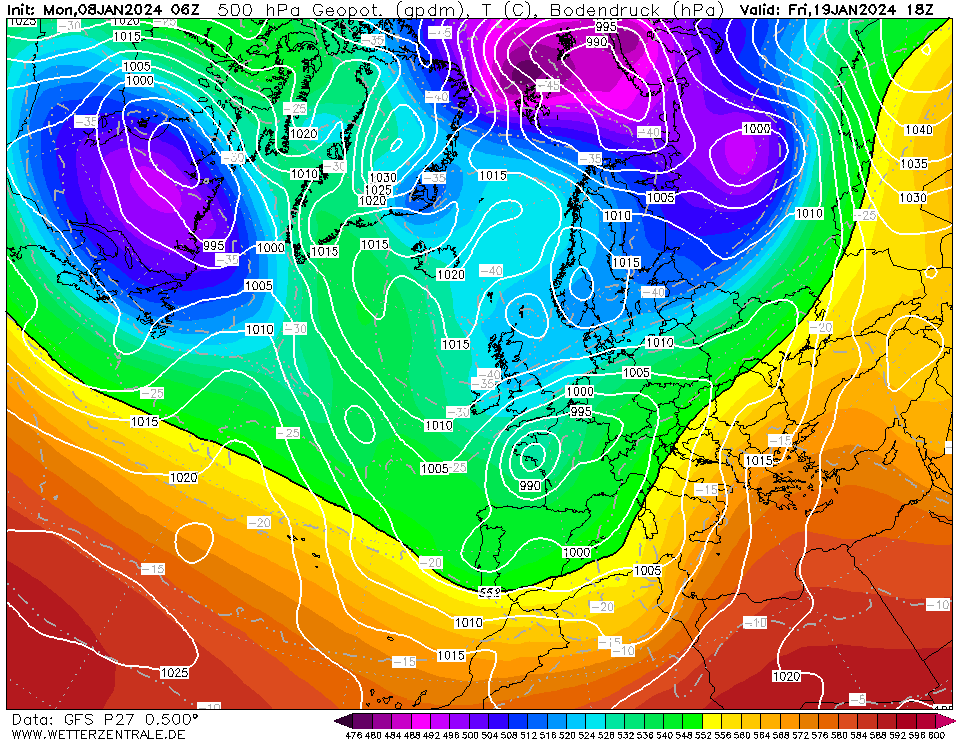 Iberische warme rug trekt door en daardoor vindt er geen interferentie plaats met de sterk geamplificeerde golf in het polaire front (blokkade, uitgezakte hoogtetrog). Hierdoor kan de trog veel zuidelijker uitzakken met totaalwinterweer tot gevolg. De sleutel naar totale winter ligt m.i. dus bij de interactie tussen het afgesnoerde (hoogte)laag nabij de Azoren met de warme rug over Iberië.