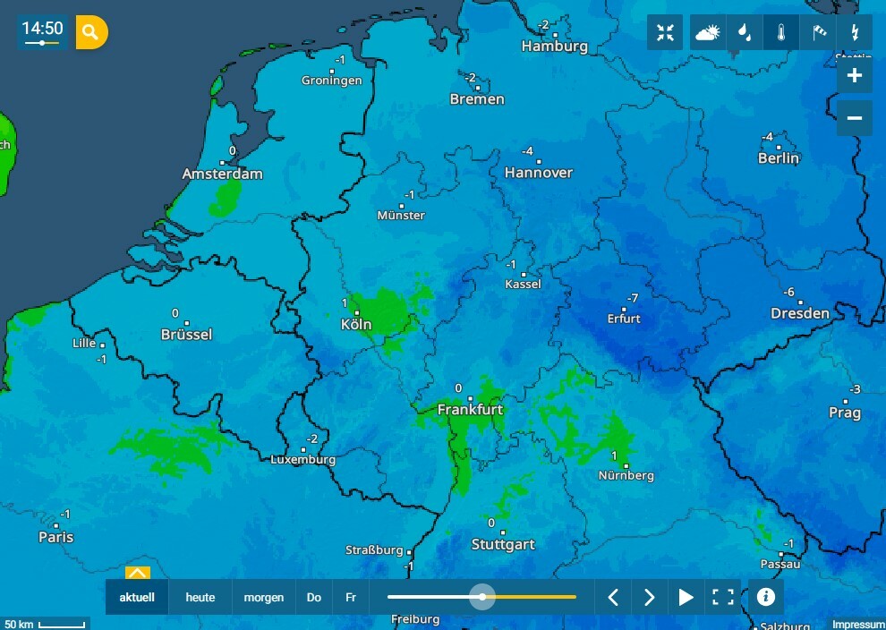 Ook in de modellen zichtbaar gister en vandaag. Zie ook de opgewarmde stukken aan de voet van de Ardennen en Duitse middelgebergten. Gebeurt wel vaker bij een matige oostelijke aanvoer.
