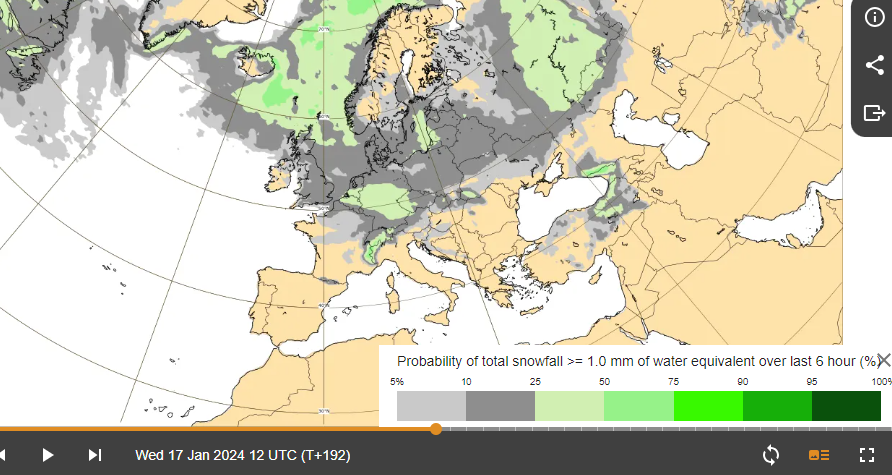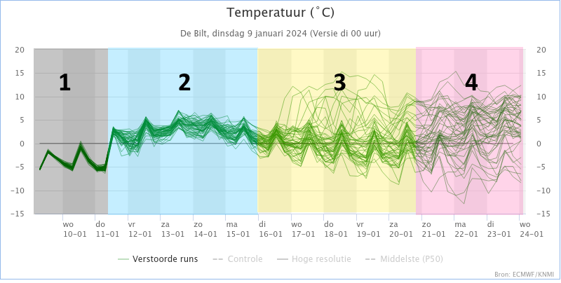 3) Vermoedelijk gekwakkel in polaire lucht, vanuit het westen nadert lagedruk. Kans dat lagedruk onderdoor trekt en de wind aflandig wordt is circa 30-40%. Kleine kans op aanzwengelen (zuid)westcirculatie met echt hogere temperaturen. Neerslagkans blijft groot door toename cyclonaliteit. Rond woensdag grootste kans op sneeuw (laagje potentieel onderlangs).