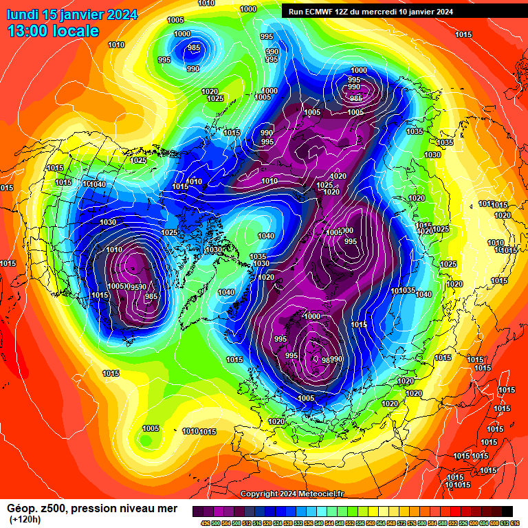 Op 96 uur hoog ten zuiden van Groenland. Laag ten NO-en. Guur