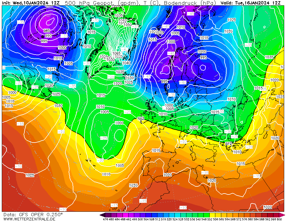 Op 96 uur hoog ten zuiden van Groenland. Laag ten NO-en. Guur
