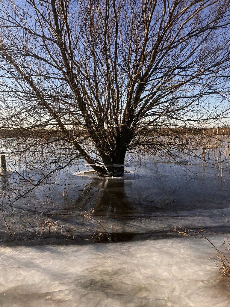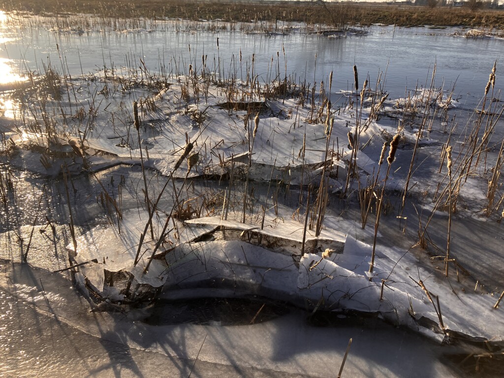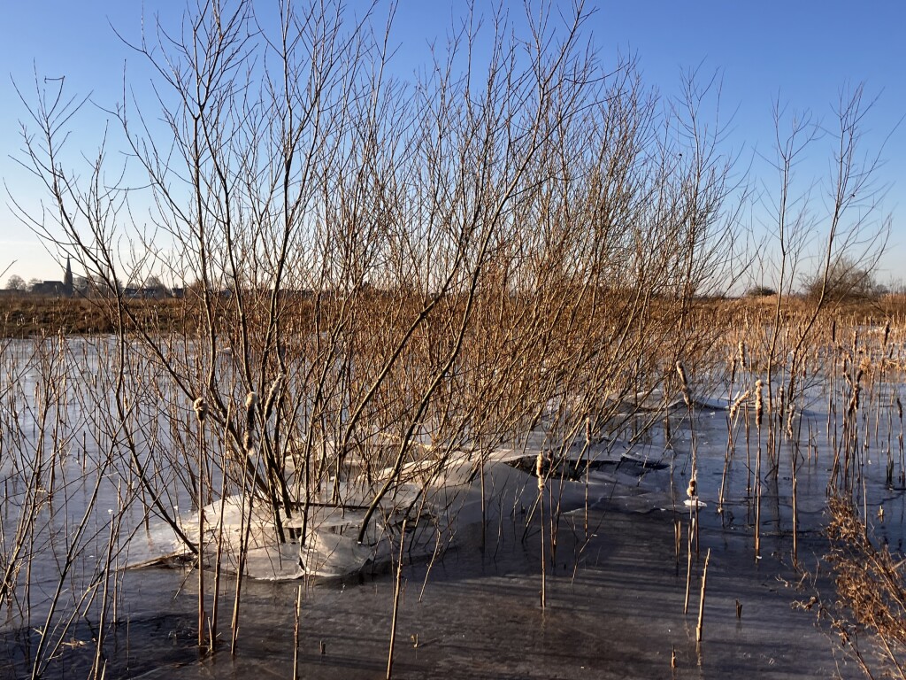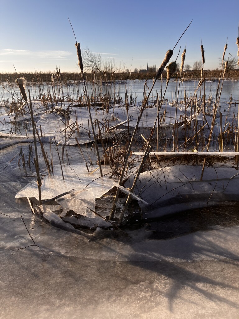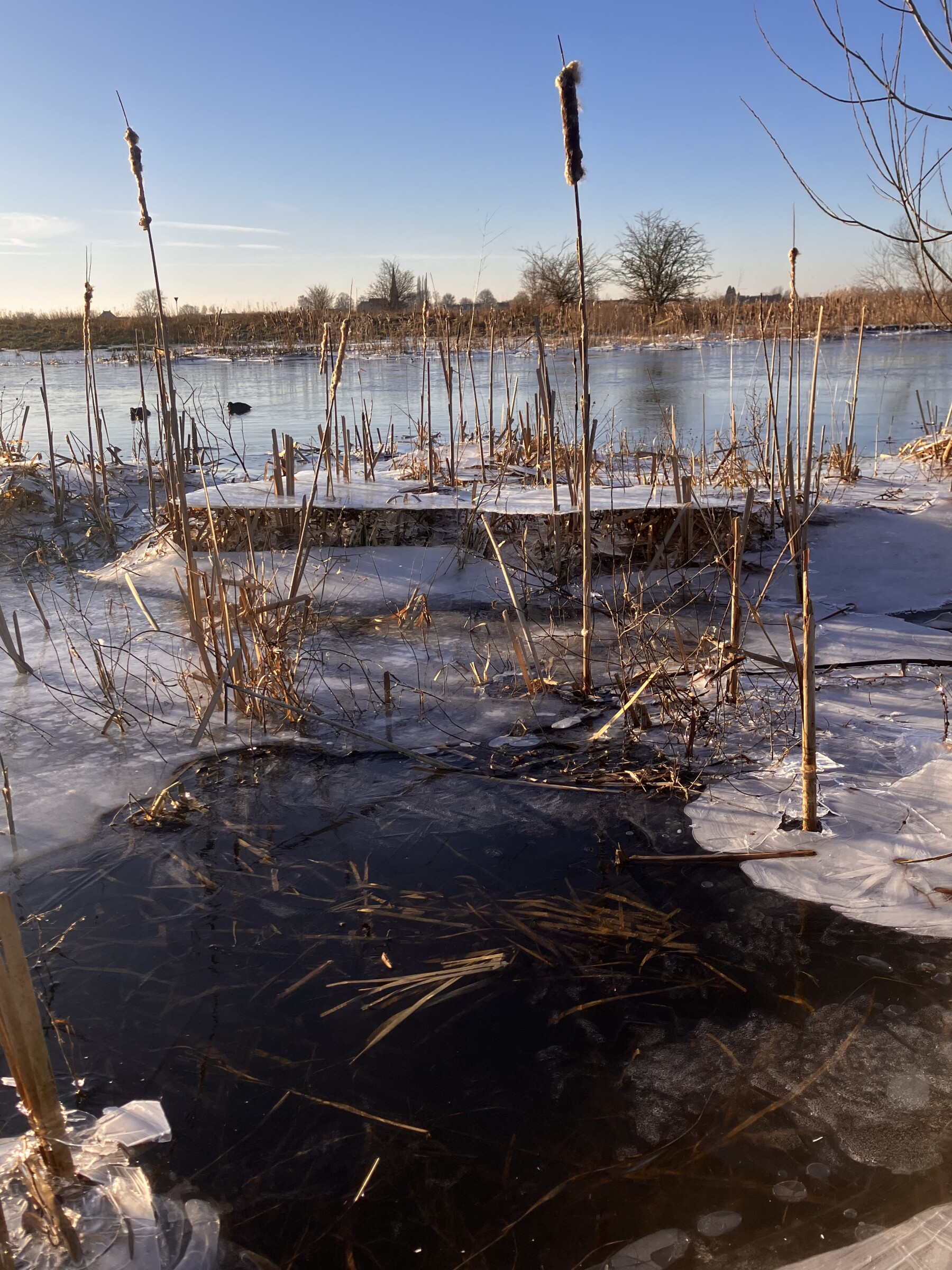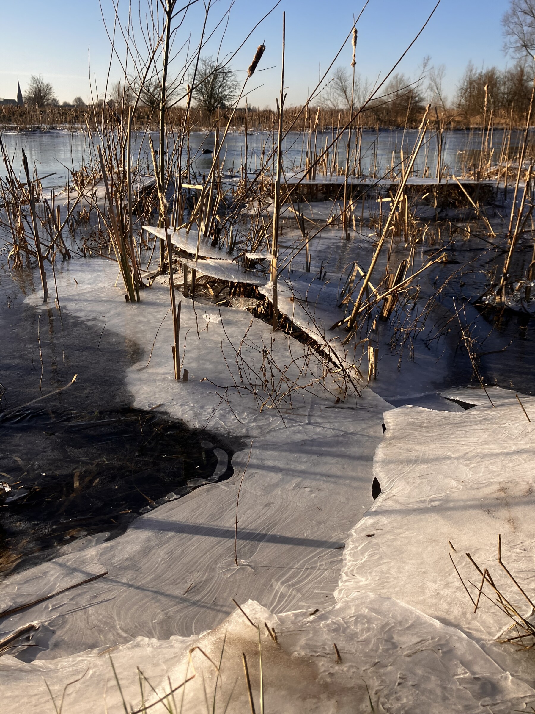 Deze foto’s heb ik vanmorgen langs de Nederrijn gemaakt. Je ziet niet alleen hoe t water gezakt is en ijsschotsen in riet en boomtakken blijven hangen. Als je er bij was hoorde je ook t ‘kabaal’ van ijs dat kapot viel op ijs. Gerinkel alsof een dienblad kristal omviel. Of je hoorde het donkere gekraak, het bewegen en loskomen van het ijs onder invloed van de levende rivier die altijd in motie is.