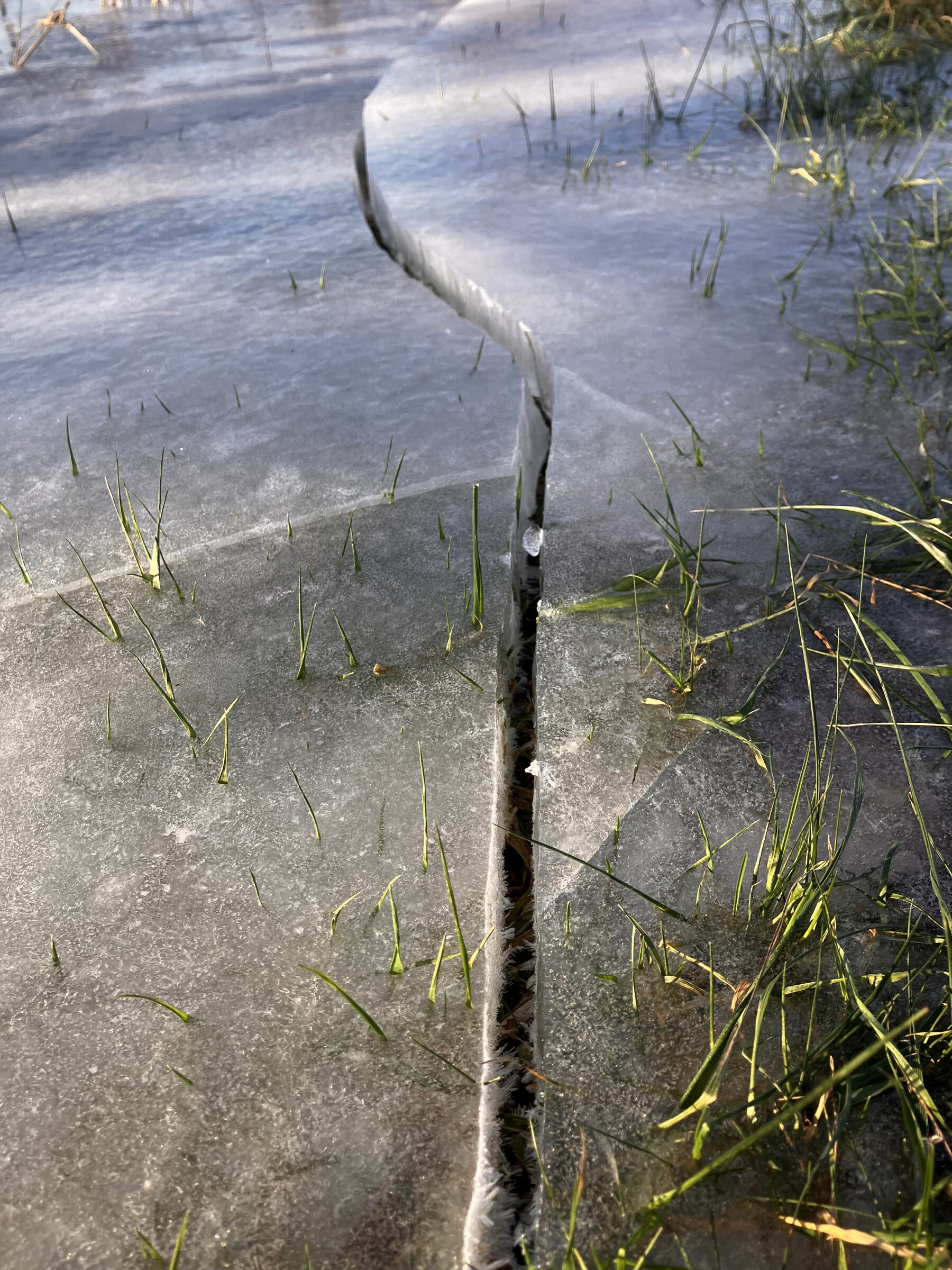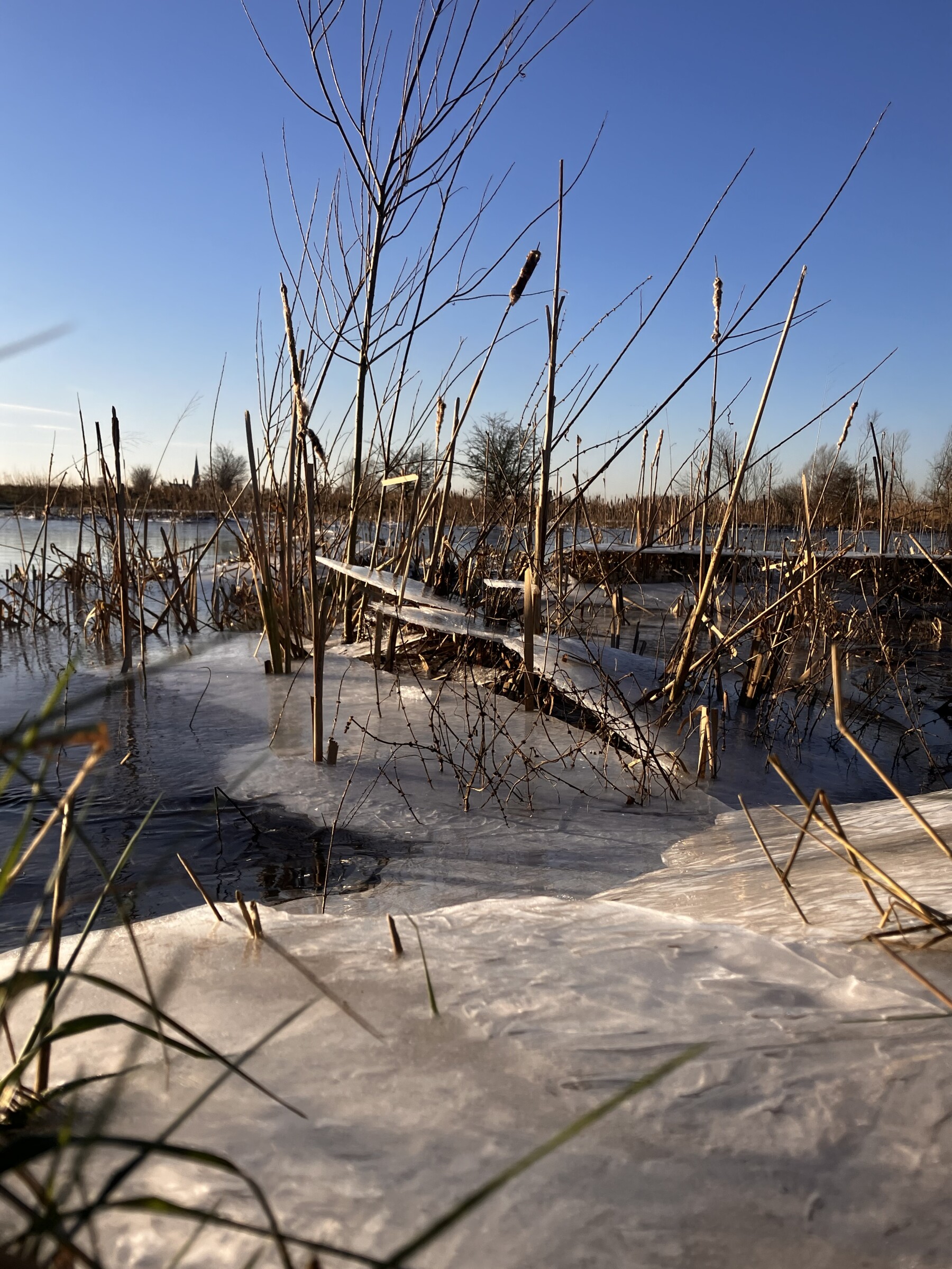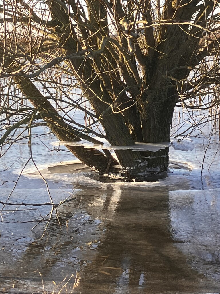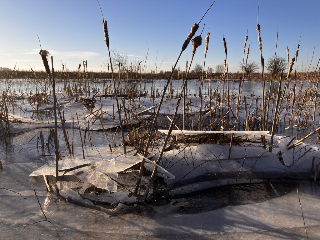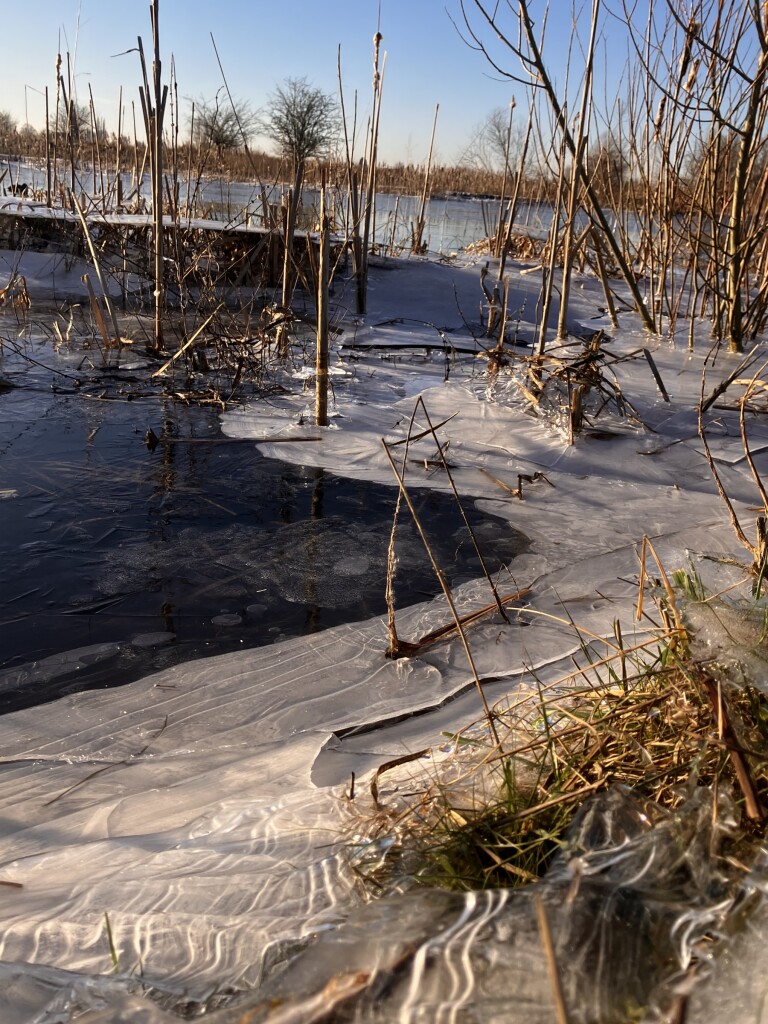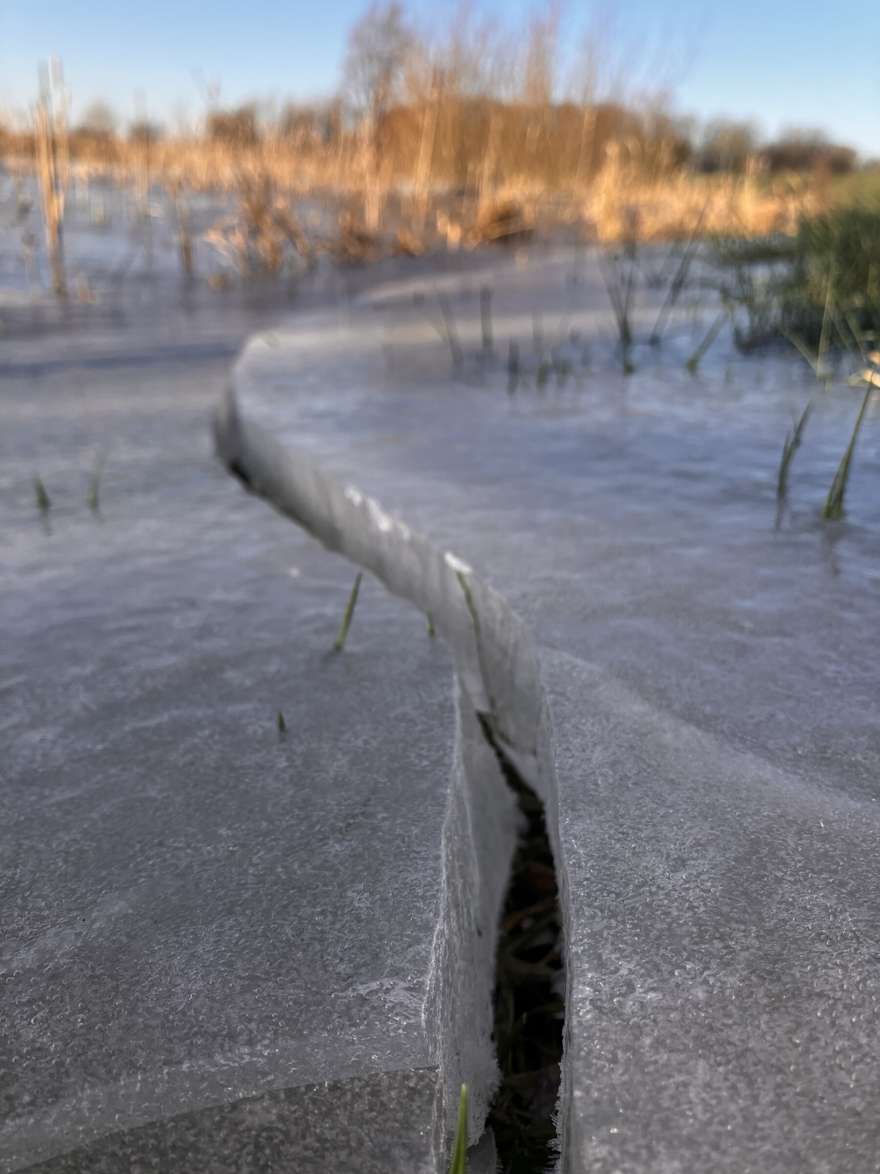 Deze foto’s heb ik vanmorgen langs de Nederrijn gemaakt. Je ziet niet alleen hoe t water gezakt is en ijsschotsen in riet en boomtakken blijven hangen. Als je er bij was hoorde je ook t ‘kabaal’ van ijs dat kapot viel op ijs. Gerinkel alsof een dienblad kristal omviel. Of je hoorde het donkere gekraak, het bewegen en loskomen van het ijs onder invloed van de levende rivier die altijd in motie is.