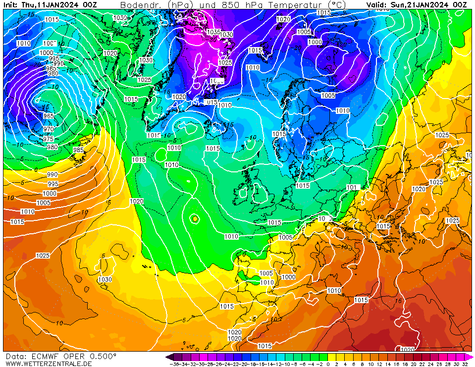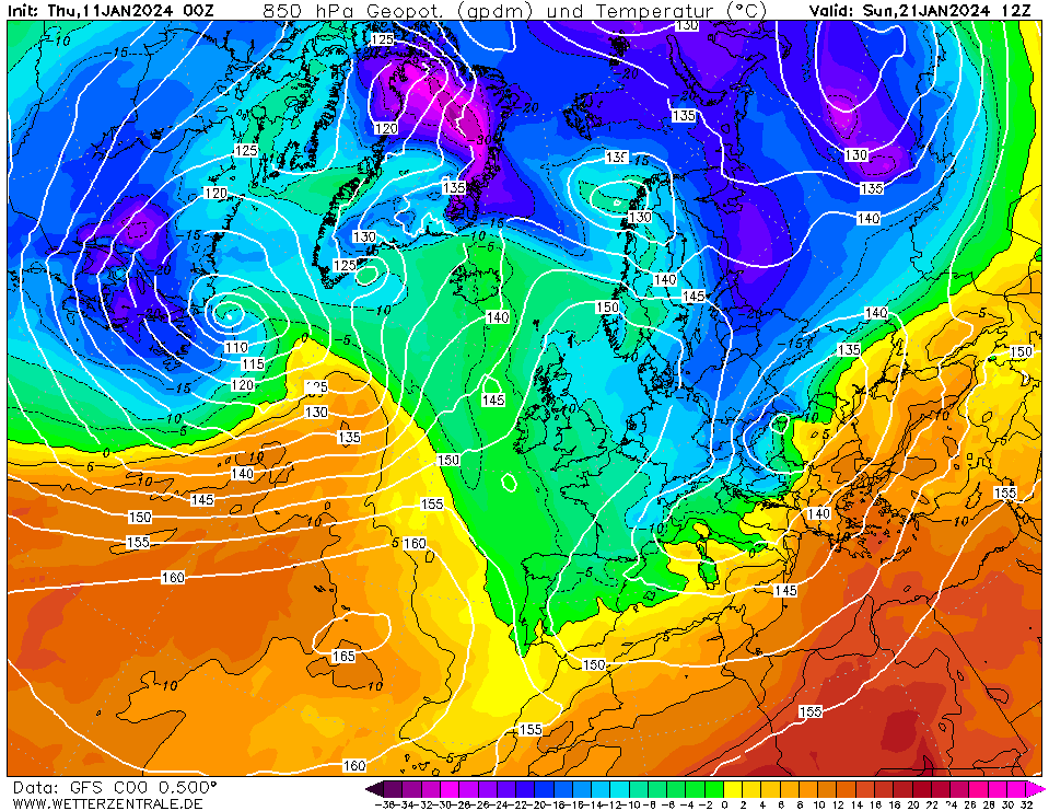 GFS 00z control, aanvoer vanuit het noordoosten met koude lucht: