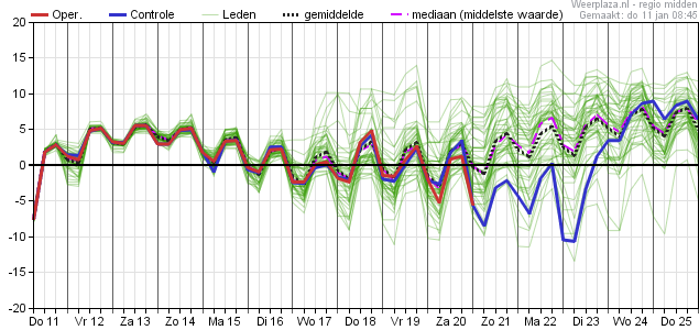 Ten opzichte van gisterenavond is het aantal (uitgesproken) zachte opties voor volgende week afgenomen en worden er door sommige leden ook opklaringen voorzien, waardoor de nachten gemiddeld wat kouder zouden kunnen uitpakken. Aan de andere kant, voorzichtigheid is geboden, want het GEFS wil er nog niet (echt) in mee. Sneeuwkansen zijn vooral rond woensdag aanwezig (op maandag overigens ook winterse buien van het noordwesten), maar nog allesbehalve zeker.