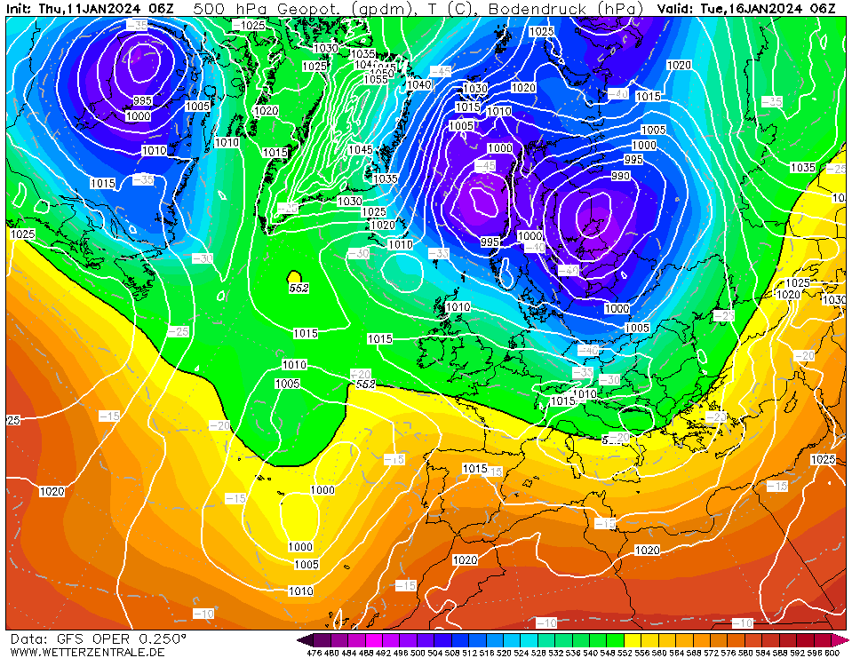 Opvallend is het laagje dat onder de blokkade bij Groenland ontstaat op +96. Op +120 ligt die tussen IJsland en Schotland (zie kaart onder). Vooruitlopend op dit laag wordt op hoogte al zachtere lucht aangevoerd.