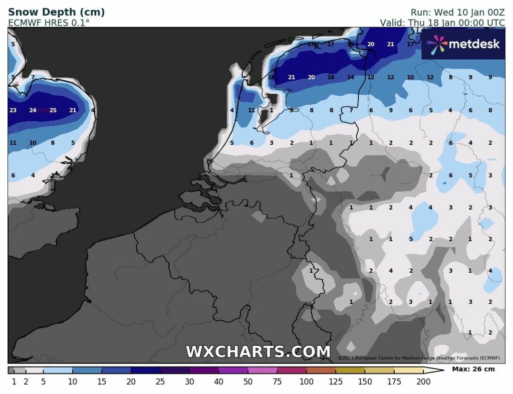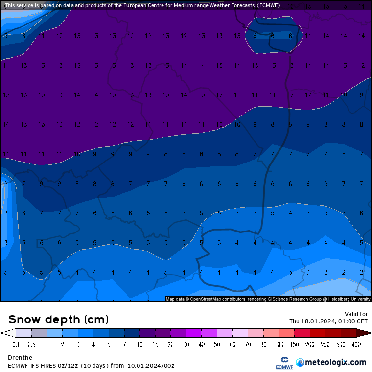 2 dagen geleden nog. Op de kaart van WXCHARTS tot 21 cm in het noorden en op de kaart van Meteologix 11 tot 14 cm. Het gaat mij er vooral om dat het kaartje van WXCHARTS telkens weer gebruikt wordt voor het aangeven van de dikte van een (mogelijk) sneeuwdek, wat dus niet klopt. Voor de minder ervaren forumleden een beetje onhandig, lijkt mij.
