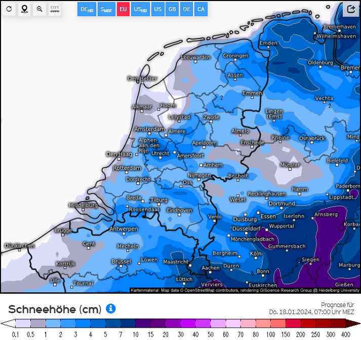 De ''Snow Depth'' kaart van WXCharts toont het sneeuwwaterequivalent. Dat is de hoeveelheid water dat in het sneeuwdek zit. Het sneeuwwaterequivalent is niet gelijk aan het totale sneeuwdek. Kachelmannwetter laat het berekende sneeuwdek wel goed zien.
