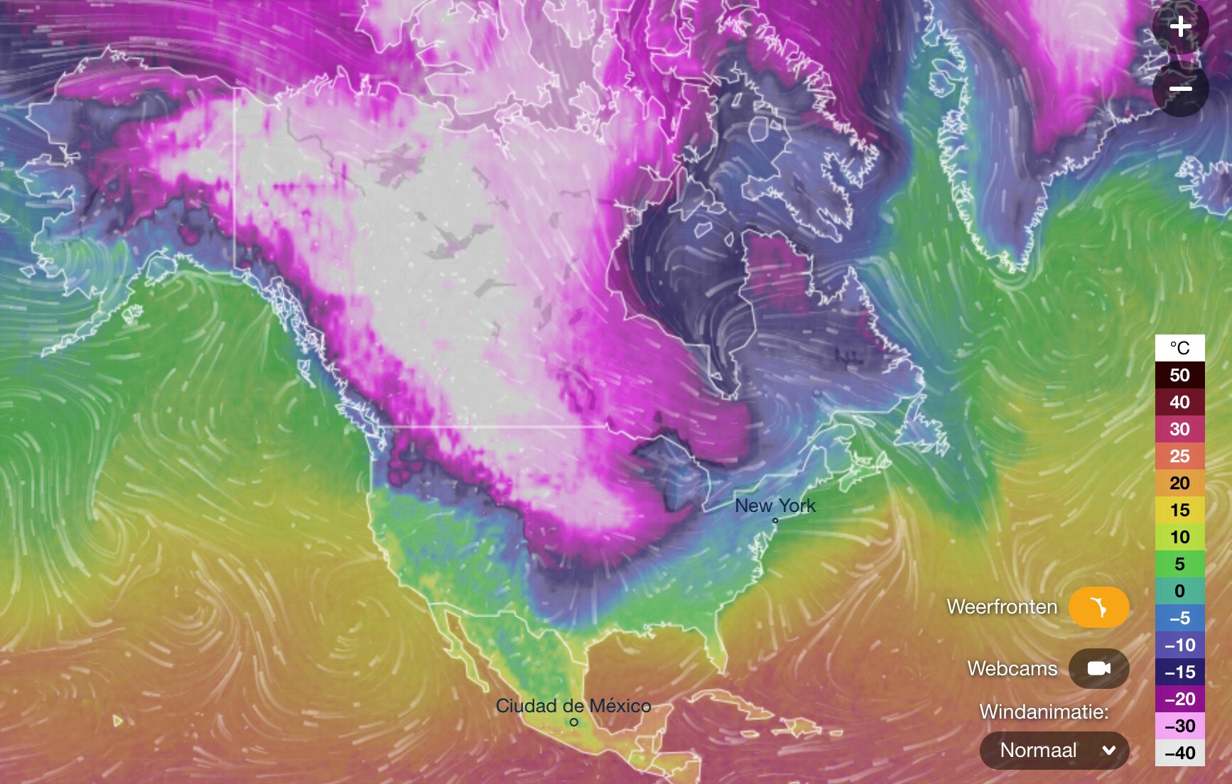 Terwijl het hier maar behelpen is met de winter is het aan de andere kant van de grote plas weer raak met de winter. Het is er voor hun begrippen ook lange tijd zacht geweest. Zo is het hoorde ik net op de radio zeggen dat in het Canadese Edmonton in 50 jaar niet meer zo koud is geweest met -40 graden. Ook valt er op uitgebreide schaal veel sneeuw.