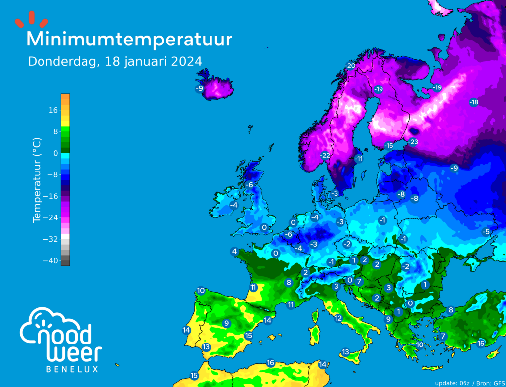 In hele gebieden in Europa tot in Griekenland, Italië en west Frankrijk aan toe vriest het. Maar Nederland valt er weer buiten.