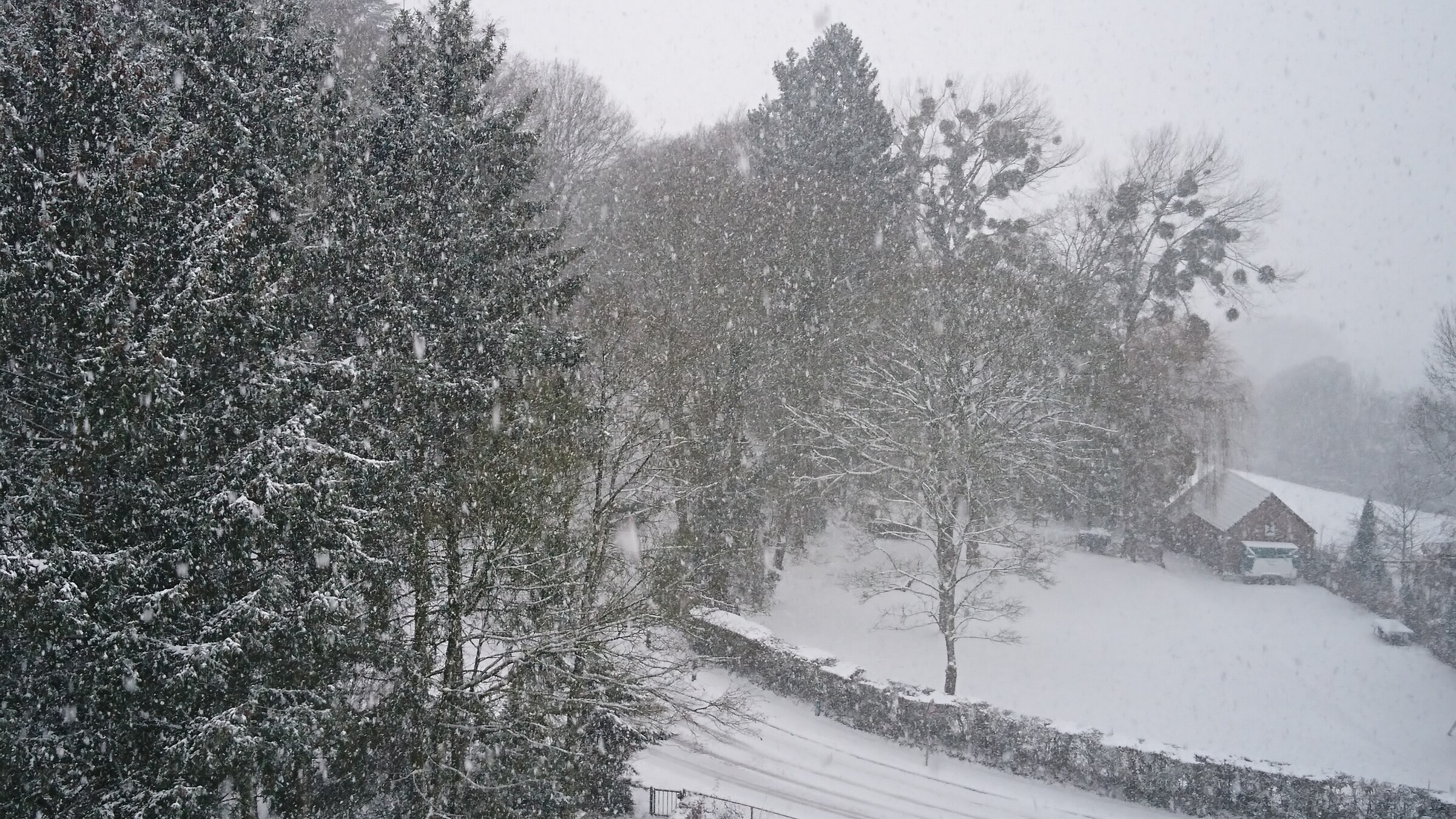 In Vaals sneeuwt het flink momenteel. Afwisselend dikke vlokken (warmere luchtlaag op hoogte) en de intensiteit is matig. Temperatuur -2