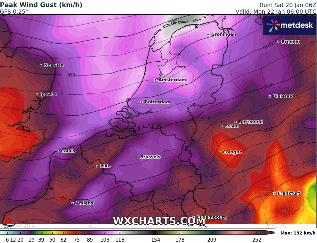 Een vrij grootschalig lagedrukgebied trekt ten noorden van Schotland langs. Door dit lagedrukgebied, die de naam Isha heeft gekregen, wordt het flink onstuimig. De kans begint steeds groter te worden dat het in de nacht van zondag op maandag gaat stormen in delen van de Benelux.