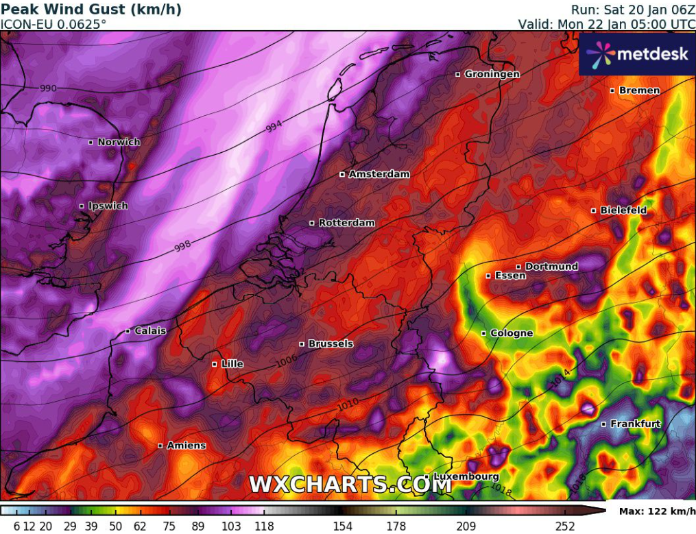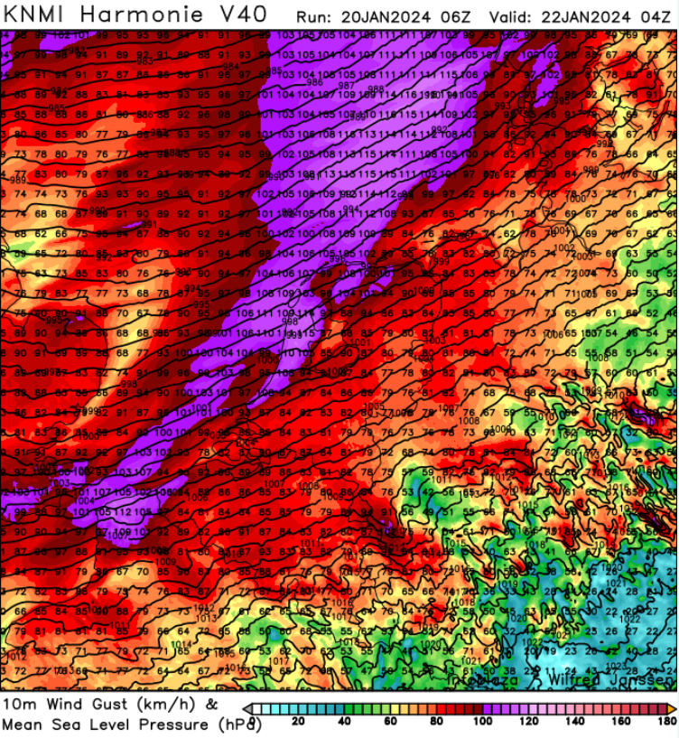 Volgens het fijnmazige weermodel HARMONIE V40 (06z) zijn er windstoten mogelijk van 115 km/u in Noord-Holland (afbeelding 5). In het binnenland zijn dan windstoten van 75-90 km/u mogelijk. Ook langs de kust van België zijn tijdelijk windstoten van 105 km/u mogelijk. In het noordwesten van Nederland is er windkracht 9 mogelijk. Op de Noordzee is windkracht 10 niet uitgesloten volgens deze run.