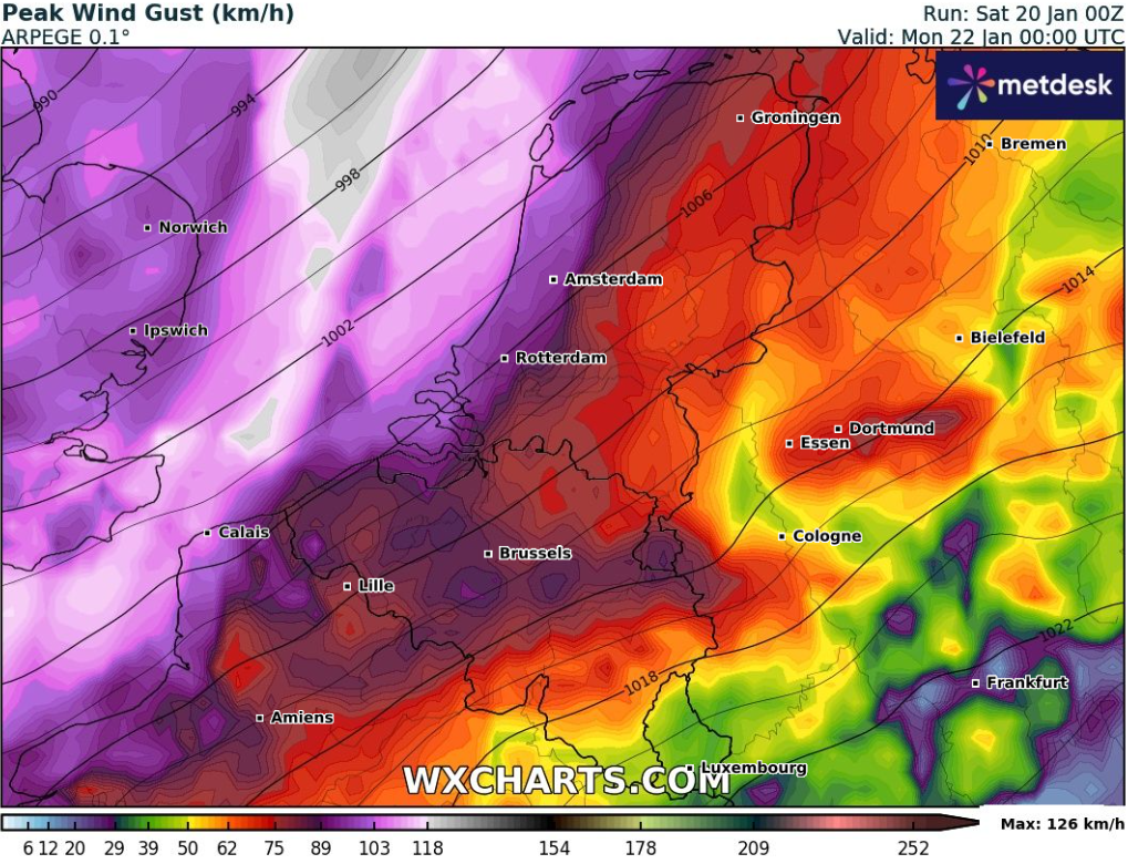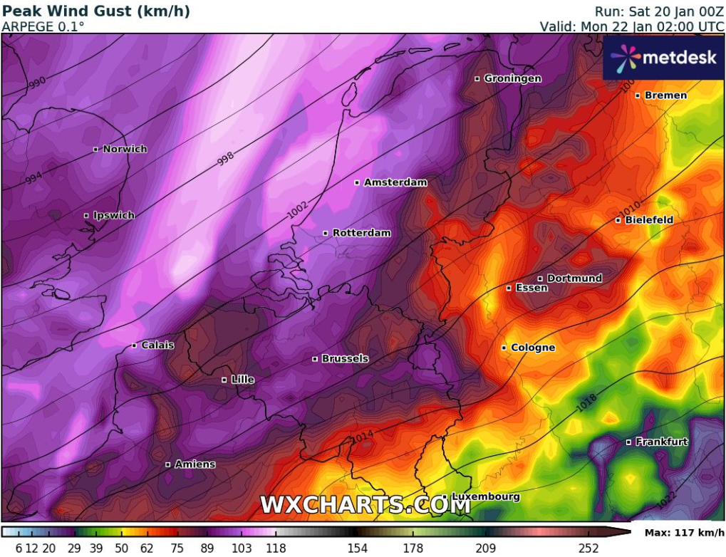 Het ICON-model (06z) komt met windstoten van rond de 117 km/u op de Wadden (afbeelding 3). Het ARPEGE-model (00z) is qua intensiteit en locatie soortgelijk aan ICON (afbeelding 4).