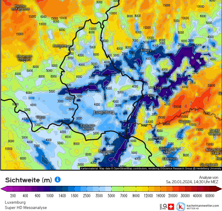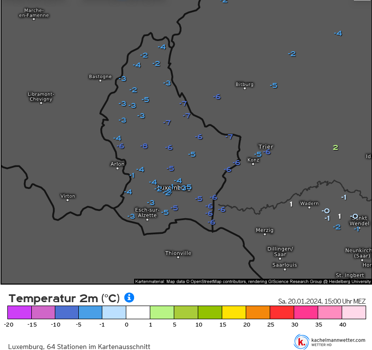 Edit: In de koude strook over het midden van het land is het mistig gebleven, en ook in het Moezeldal, maar elders scheen bijna overal de zon. Als je de mistgebieden buiten beschouwing laat is het overal ongeveer 2 graden kouder dan verwacht; dat valt dan nog mee. En die afwijking zou dan komen door de aanvoer van koude lucht uit de mistgebieden. Dus is dat de hoofdoorzaak.