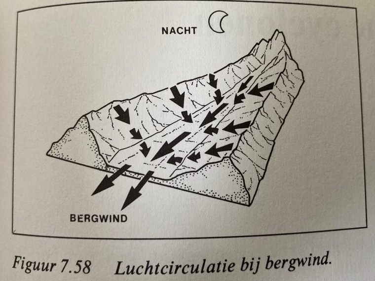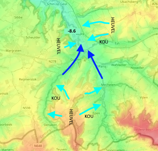 Alle koude lucht stroomt het dal in, en hoe lager in het dal (stroomafwaarts), hoe meer kou zich kan verzamelen. Helemaal ideaal is als je in een soort kommetje zit waar de kou gevangen wordt en geen kant meer op kan. Hoe dan ook een mooi voorbeeld van een scherpe grondinversie. Sneeuwdek ter isolatie van de grond erbij en voila.