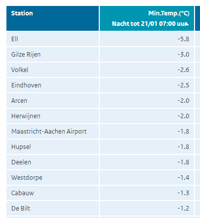 En als je dan kijkt naar de minimumtemperatuur van de afgelopen nacht, dan zie je dat Ell een koude uitbijter was t.o.v. de andere stations in het zuidoosten. En dan wordt er gezegd: "Nou, het gaat weer lekker bij het KNMI. Het klopt nu al niet meer..."