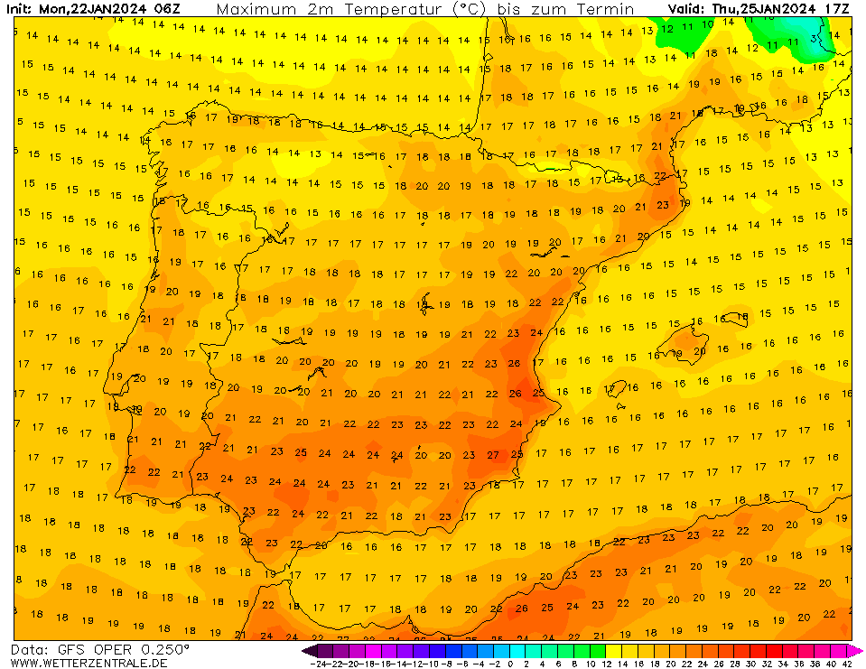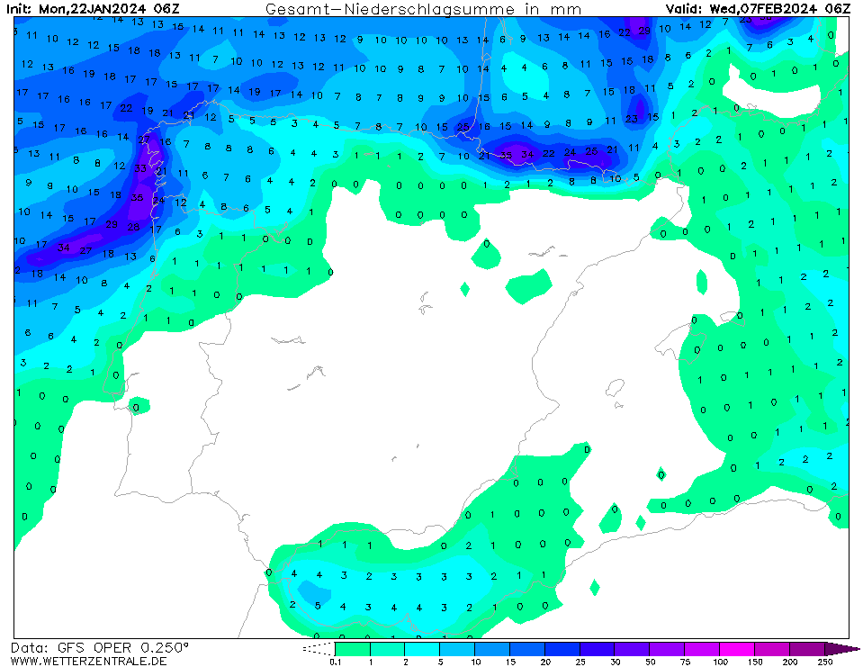 Bekijk je de uitvoer van GFS (06z), dan zullen velen daar er niet blij mee zijn denk ik. In vrijwel heel Spanje geen druppel regen de komende 16 dagen en temperaturen die komende donderdag 'gewoon' een zomerse 25 - 28 graden kunnen bereiken in plaatsen langs de oostkust.