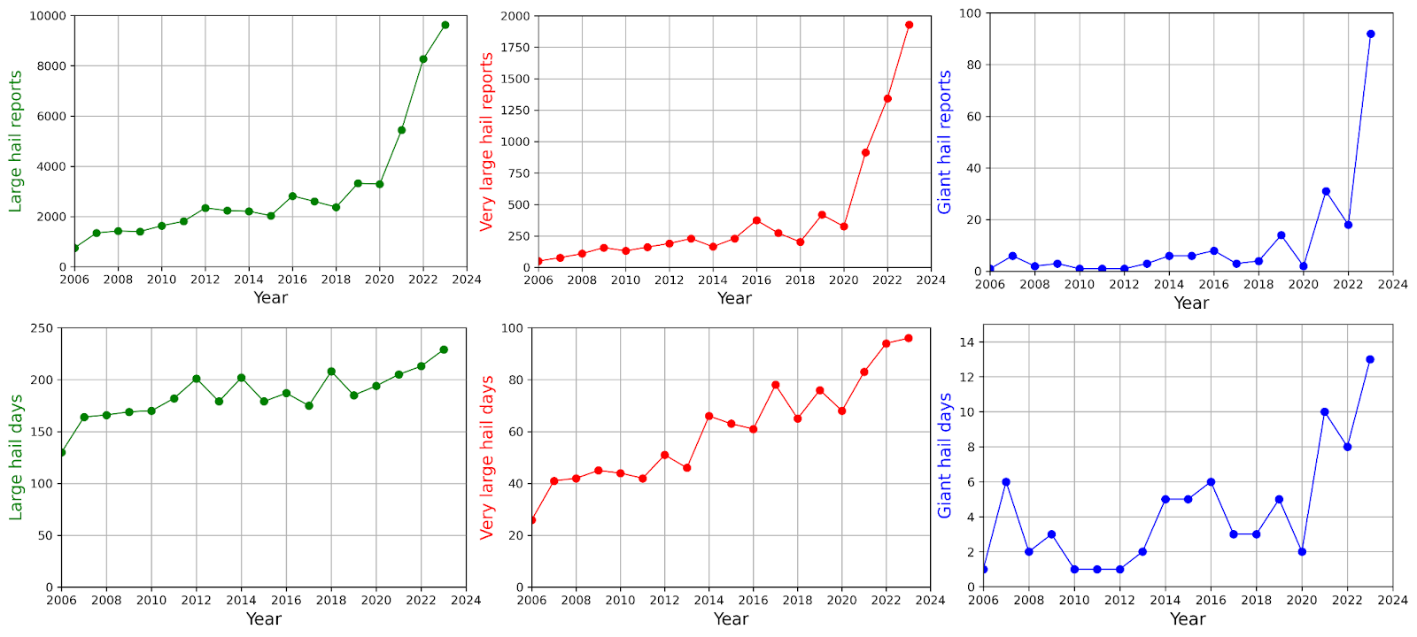 Deze rapportage vindt logischerwijze plaats in samenhang met enkele grote Europese verzekeringsmaatschappijen. Daar zal nu ook wel een lampje gaan branden, als dat al niet eerder gebeurd was. Het artikel van de ESSL is te vinden in onderstaande link, en de grafiek daaruit die ik noemde plaats ik hier ook, evenals de Europese kaart met de maximale hagelgrootte in 2023. De strook over noord Italie is duidelijk; daar kwamen haast alle extreme meldingen vandaan.