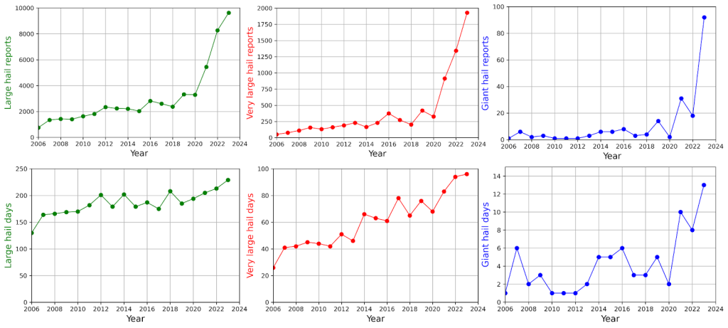 Vandaag is het jaarlijkse verslag verschenen over de rapportage van zware hagel in Europa. Dit wordt opgesteld door de (of het) European Severe Storms Laboratory. In de weergegeven grafieken valt vooral op dat het aantal meldingen van grote en zeer grote hagel (> 10 cm) de laatste jaren enorm sterk toeneemt. Dit kan hooguit deels veroorzaakt worden door het feit dat tegenwoordig een groter percentage van de meldingen de ESSL bereikt. Deze ontwikkeling is beslist zorgelijk te nomen: stel je voor dat die toename nog verder doorgaat met dezelfde snelheid.