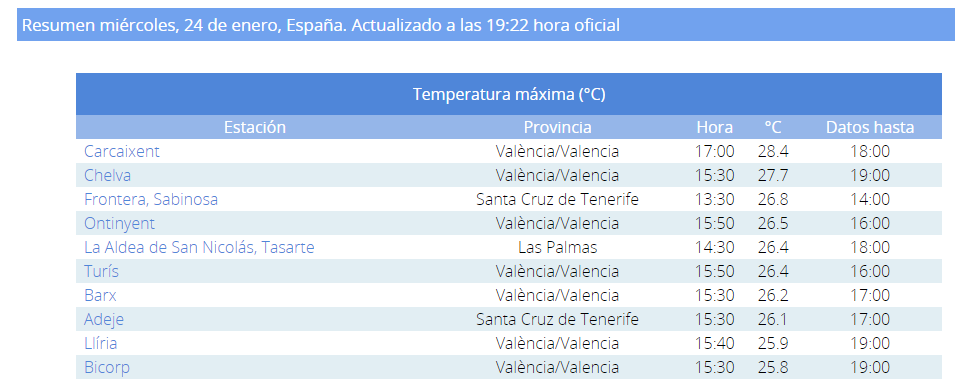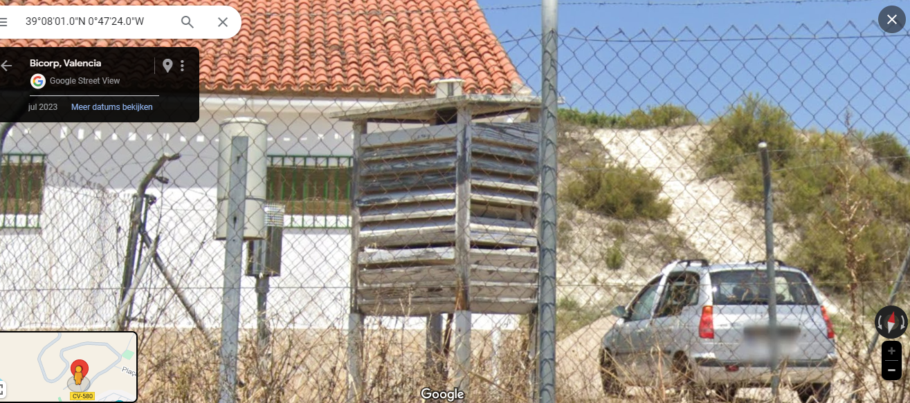Waarbij wel altijd aangetekend moet worden dat de opstellingen in Zuid-Europa (ook in Spanje) vaak niet voldoen aan WMO-standaarden. Op het station van Bicorp bijvoorbeeld (laatste in deze lijst) mag de weerhut wel een update/likje verf gebruiken. En zo zijn er meer stations die vanuit WMO-perspectief een hoog 'clownsgehalte' hebben, maar voor ons weeramateurs wel leuk zijn om te volgen en soms ook een goede inkijk geven in lokale effecten, ook vanwege meten in stedelijke omgevingen. Het grappigste station dat ik ooit heb gezien is die van Maubeuge van de Franse weerdienst. Die voeg ik ook even toe aan het eind van dit bericht. Daar kan Arcen nog een puntje aan zuigen.........