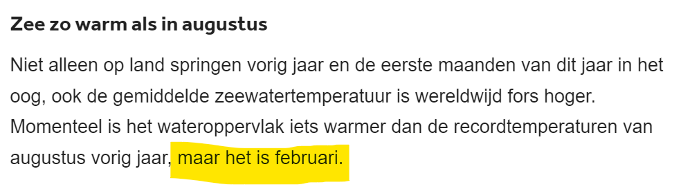 De stagiair van de NOS slaat weer eens toe: "Momenteel is het wateroppervlak iets warmer dan de recordtemperaturen van augustus vorig jaar, maar het is februari". Zullen ze bij de NOS weten dat het op het zuidelijk halfrond gewoon zomer is? En februari daar equivalent is aan augustus op het noordelijk halfrond? En dat de gemiddelde zeewatertemperatuur wereldwijd dus makkelijk hoger kan zijn dan in augustus?