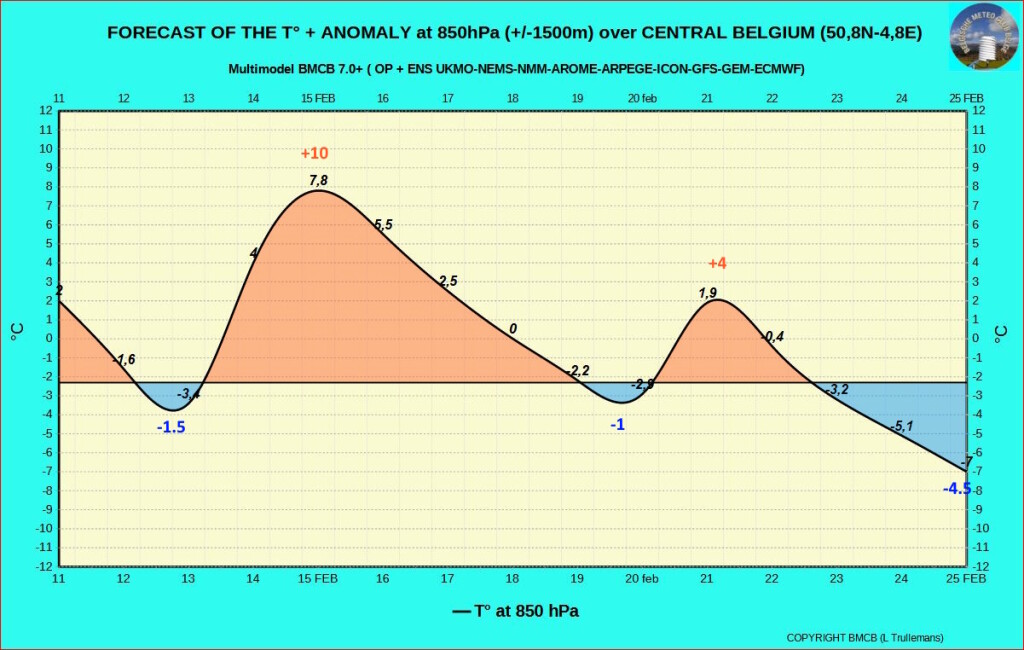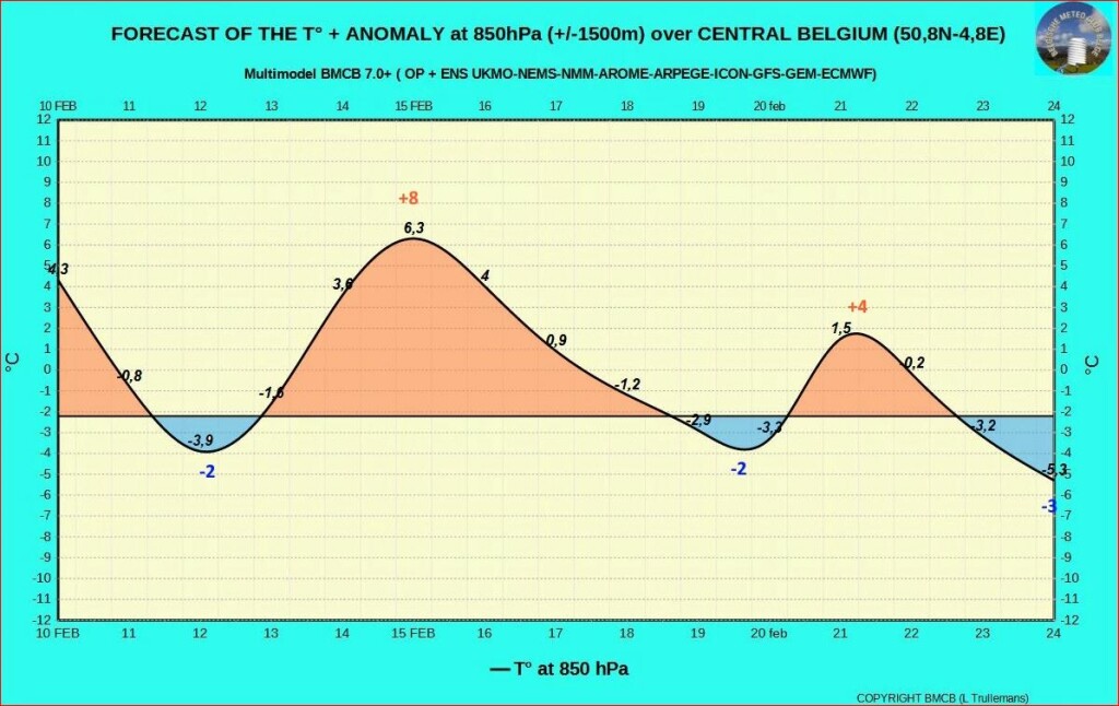 Na de opstuw van zeer zachte lucht rond donderdag 15/2/24 met een T° afwijking rond +10°, wordt sinds 2 dagen een geleidelijke maar golvende afkoeling op 850 hPa in het vooruitzicht gesteld met negatieve afwijkingen tegen het einde van de periode...