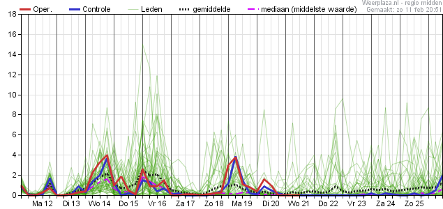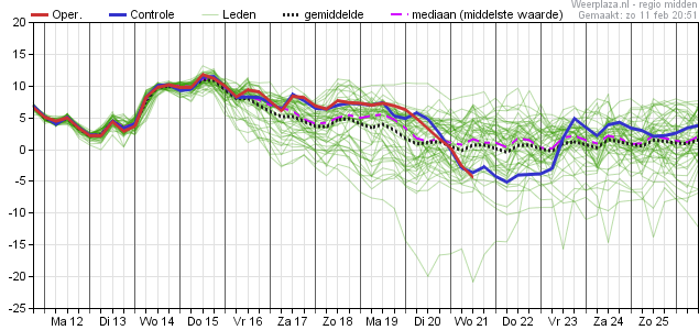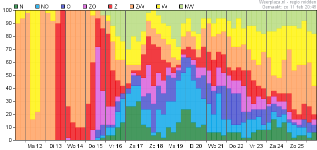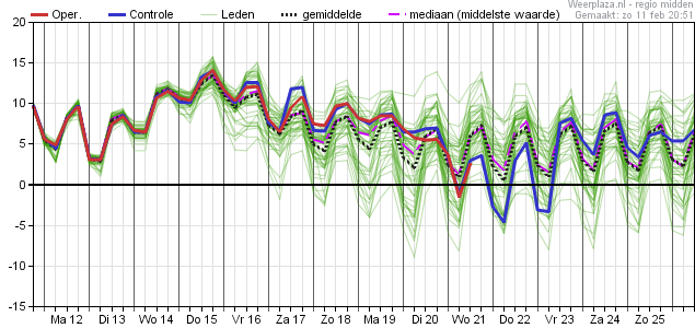 achtereenvolgens: Temp, dauwpunt, neerslag, windrichting kanspluim