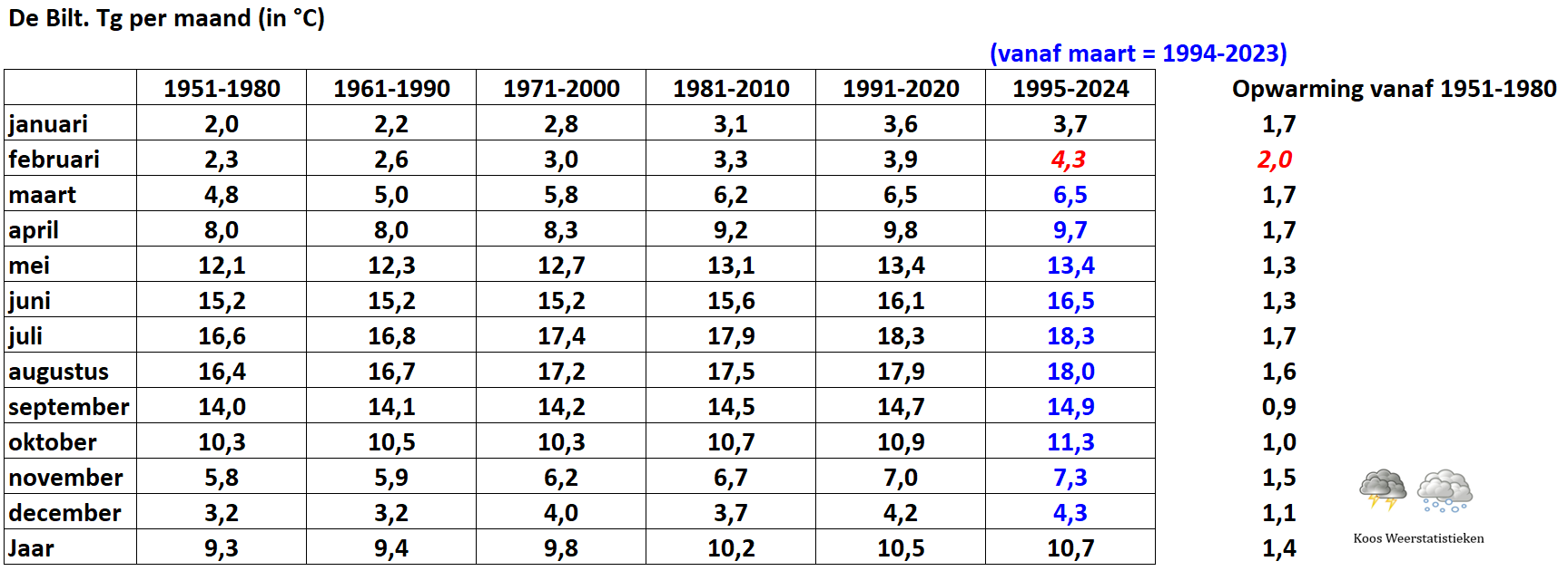 Voor januari en februari kijk ik naar het gemiddelde van 1995 t/m 2024. Voor de overige maanden van het jaar naar het gemiddelde van 1994 t/m 2023.