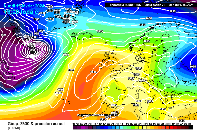 Veel waarschijnlijker is echter de rug ten zuidwesten van ons met aanvoer van erg milde oceaanlucht, veel bewolking en af en toe wat regen (afhankelijk van nabijheid van het hoog).
