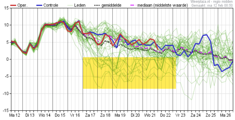 Goed te zien aan de dauwpuntspluim (het gele cluster). De rug moet zich dan ten noorden van ons opwerpen, waardoor er droge en koudere continentale lucht kan instromen. In dat geval zon, vorstnachten en overdag ruim in de plus.