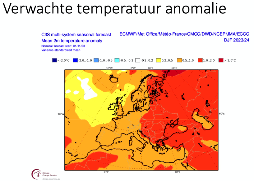 De relatieve verwachtingsafwijking voor onze omgeving is nog een flink stuk "opgehoogd". De afwijking zal ongeveer 2,3 °C zijn met de huidige verwachtingen.