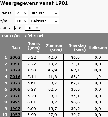 Nou nee hoor: 1990 had over de laatste decade van januari en de eerste decade van februari een Tg van 7,7°C; dat is iets hoger dan dit jaar. Tegenwoordig zitten we er veel meer bovenop met alle beschikbare data, en daardoor kan het dramatischer lijken dan het in werkelijkheid is. Of andersom natuurlijk, dat we vroeger niet in de gaten hadden wat er gebeurde. Zelfs nog nauwelijks in 2002, dat was toch mooi voor het huwelijk van Willem-Alexander en Máxima? En dat was anderhalve graad warmer dan dit jaar en 1990. Vóór 1990 was de hoogste waarde over deze periode 6,0°C.