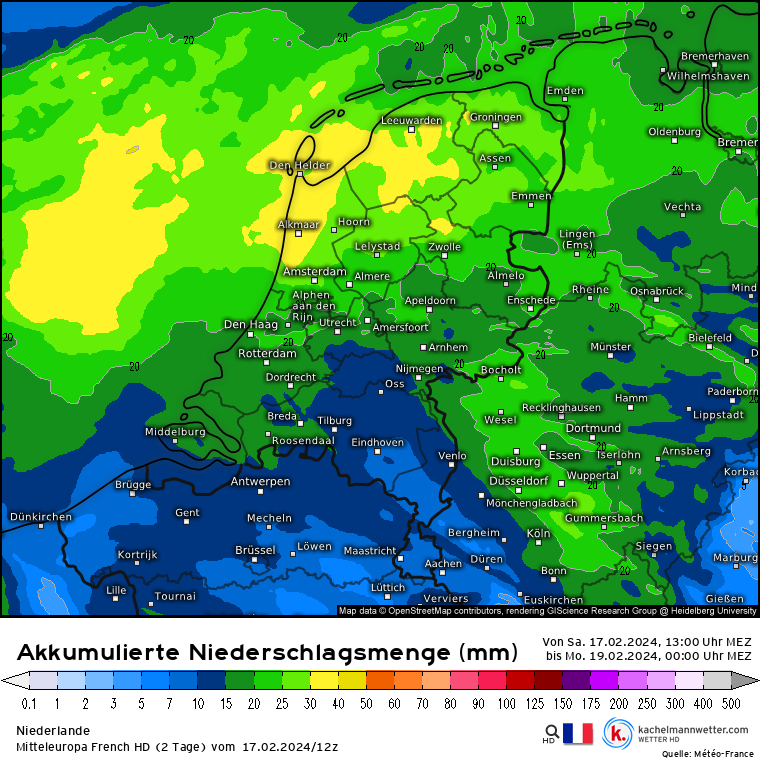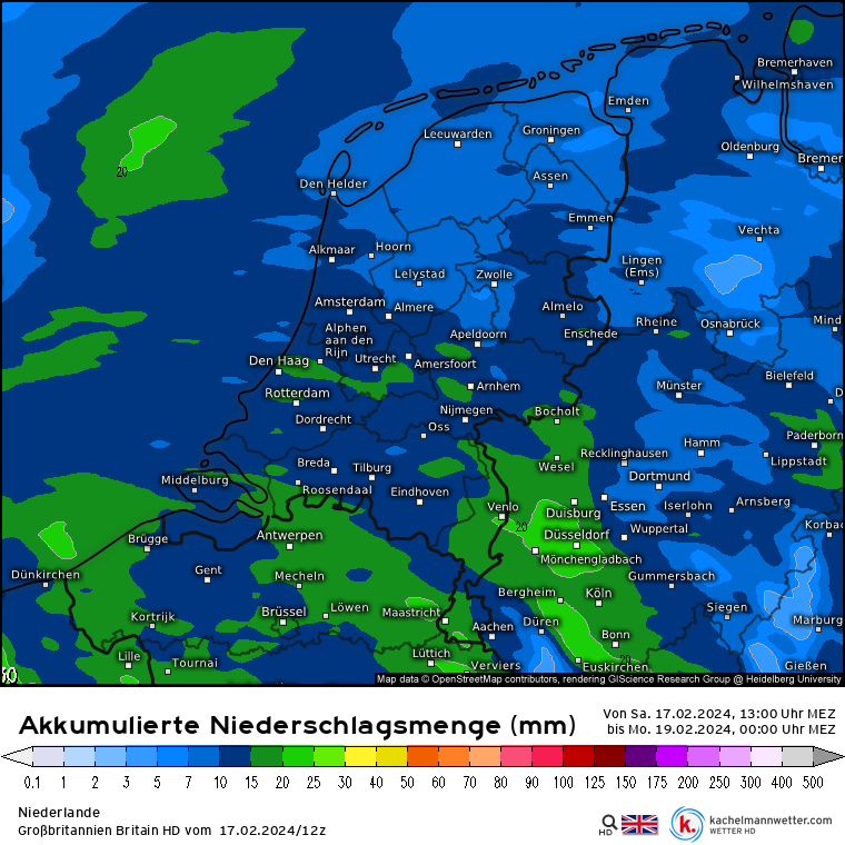 De regen. Het beeld nu en de verwachting. 15 tot 18 uur achter elkaar
