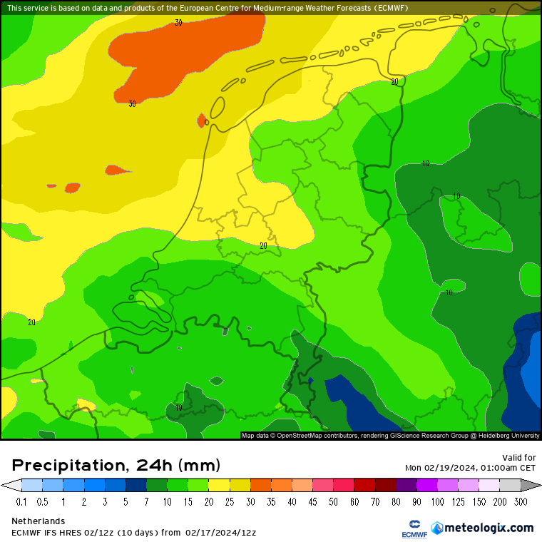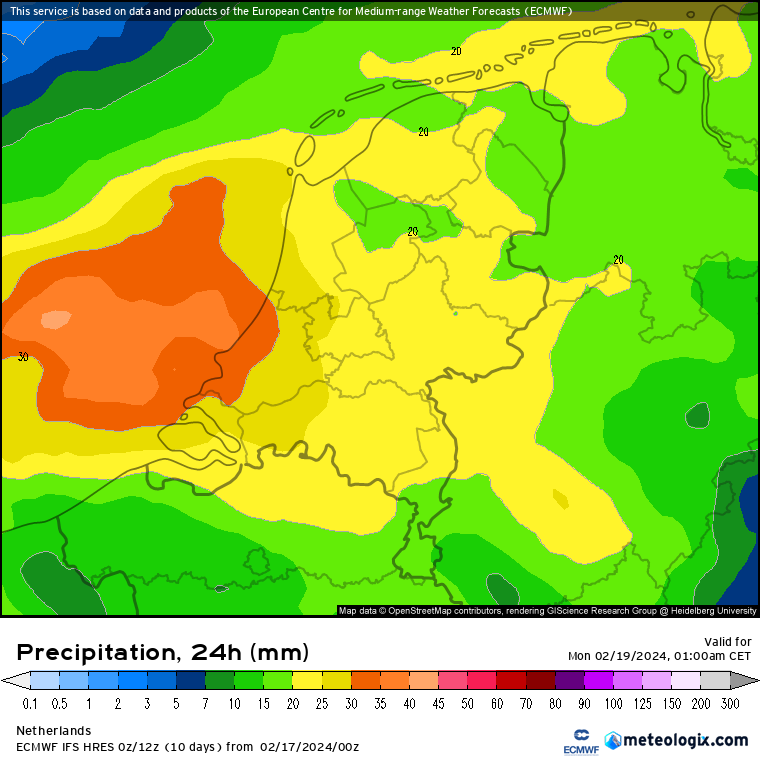 De regen. Het beeld nu en de verwachting. 15 tot 18 uur achter elkaar