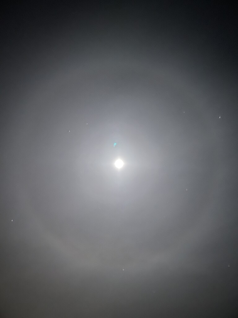 Niet zo heel mooi op de foto (iPhone), maar in het echt wel! Het gaat om de buitenste/grote ring. De kleinere kring lijkt door weerkaatsing oid van mijn telefooncamera te komen.