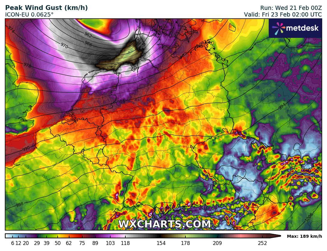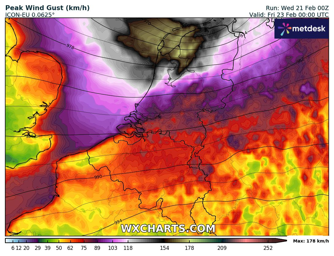 Berekent windstoten van 170+ km/u rondom het IJsselmeer en later 189 km/u in de Duitse Bocht.