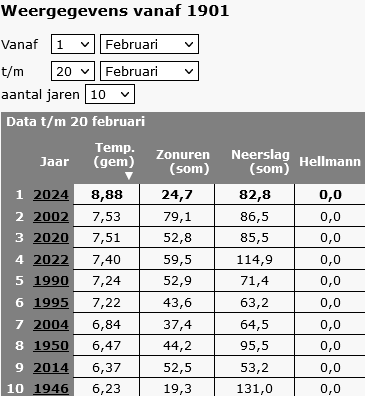 Van 1 t/m 20 februari was de gemiddelde temperartuur in De Bilt bijna 8,9°C; een verbetering van de vorige recordwaardes uit 2002 en 2020 met ruim meer dan een graad. Het gevaar is, dat dit langzamerhand 'normaal' wordt gevonden, of 'iets boven normaal'.