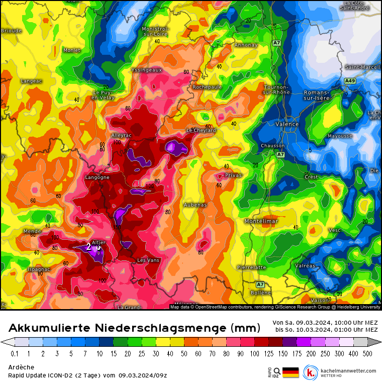 Meerdere berekeningen geven piekwaardes van ruim 200 mm tot middernacht. Hieronder de 09Z van ICON-D2, die net binnen is.