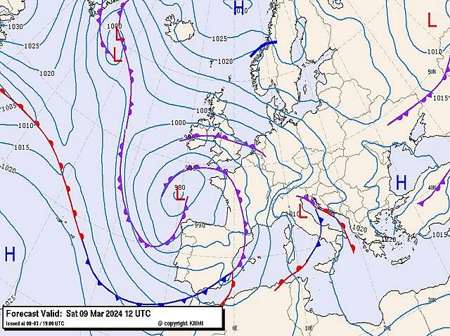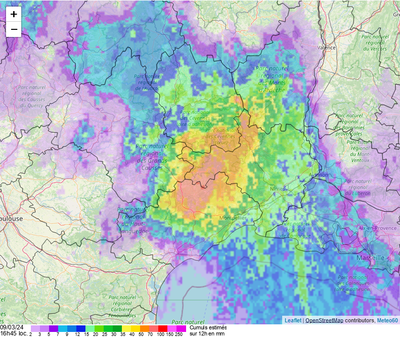 Het zat al een paar dagen in de verwachting, en nu begint het dan: een tamelijk vroege 'épisode Cévenol', wat inhoudt dat er in zuid Frankrijk in de omgeving van de Cevennen veel regen gaat vallen. In de zomer gebeurt dit nogal eens in onweerssituaties, maar in dit geval is er sprake van de langzame passage van een occlusiefront, behorend bij een lagedrukgebied ten westen van Frankrijk.