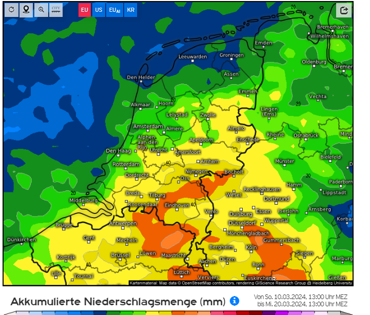 met name voor regio ZO waar tussen maandag en dinsdag al ruim 30mm lijkt te gaan vallen cumulatief.