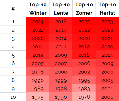 Voor de winter staat 40% van de top-10 warmste ooit gemeten op naam van een jaar uit de vorige eeuw (4 van de 10). Voor de lente en zomer gaat het om 3 van de 10 jaren (30%), terwijl de gehele top-10 voor de herfstmaanden uit jaren van de 21e eeuw bestaat.