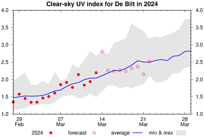 Flink hoger dan de tot nu toe hoogste UV-waarde op 14 maart, en we overtreffen deze verwachte waarde dus ook nog in de praktijk.