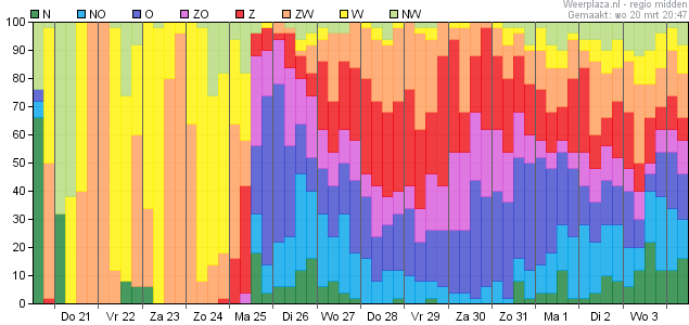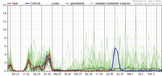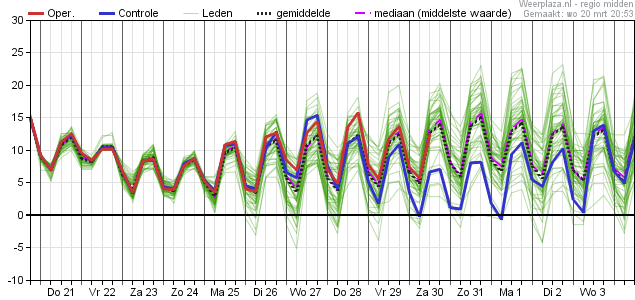 Ook hier op termijn 'gewoon' weer temperaturen die richting de 15 graden gaan (normaal voor eind maart is circa 11 graden). Na het weekend ook weer afnemende neerslagkansen en een groot aantal leden met een aflandige stroming.