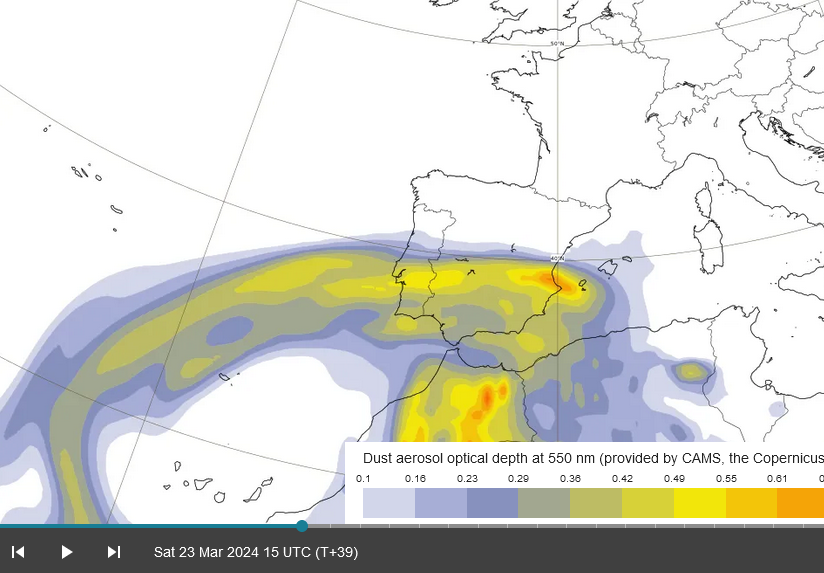 De verwachting van Copernicus geeft voor morgenmiddag een piek in Saharastof langs de Spaanse oostkust, ongeveer ter hoogte van Valencia. Eens kijken of daar dan beelden vandaan komen.