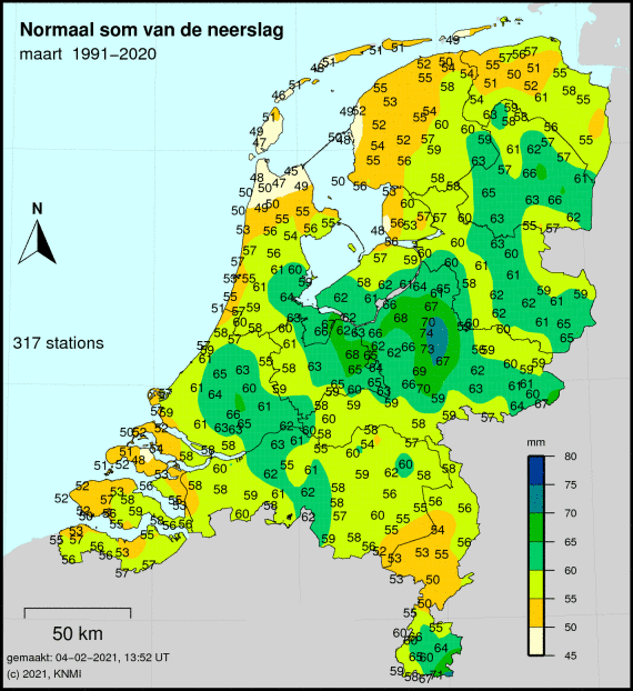 Dat denk ik niet. In Zeeuws Vlaanderen, bijna heel Noord Brabant en Limburg is maart 2024 natter dan normaal. Hier zijn de normalen. Pas als je een marge van 30% aanhoudt kom je in de buurt van 98%, schat ik in.